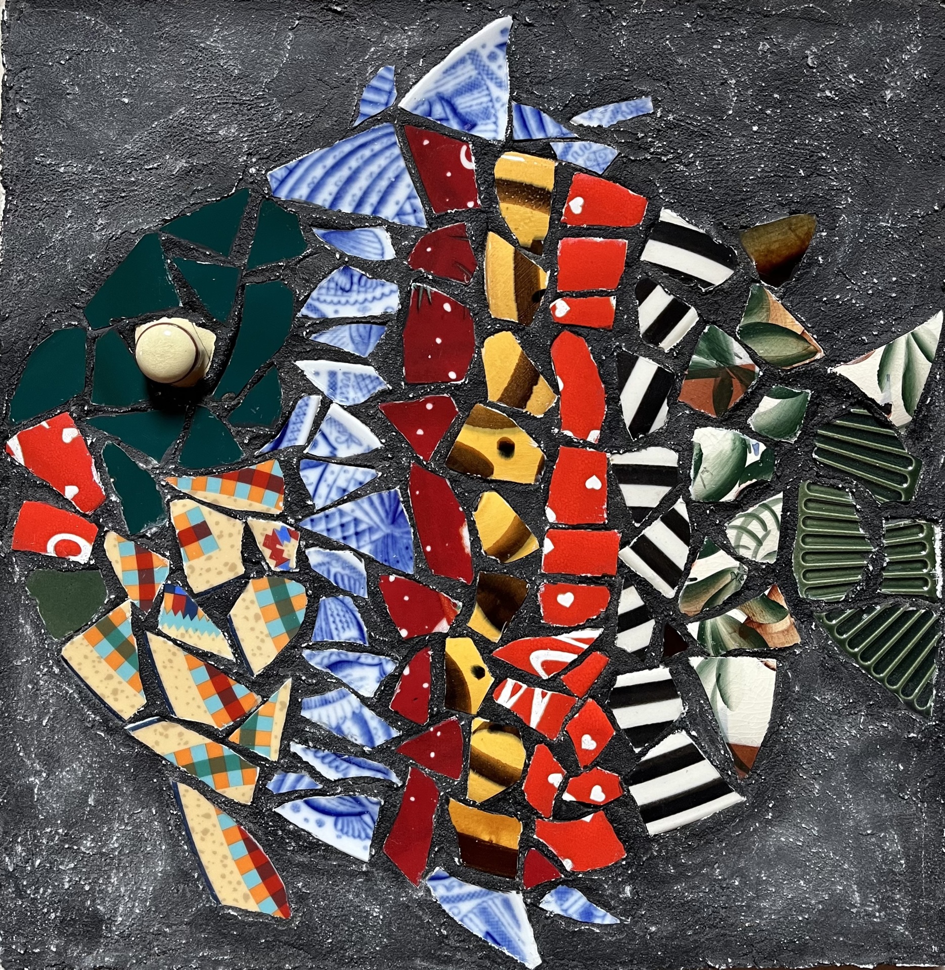Серия "Небылицы". Декоративное настенное панно, оформлено в раму. Работа сделана в технике "ломаной" мозаики ("тренкадис") из кусочков разбитой посуды.