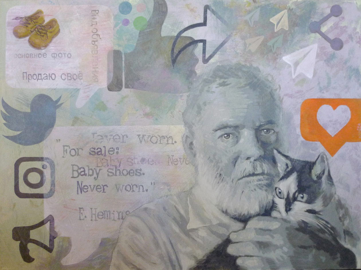 Один из самых известных литературных споров выиграл Эрнест Хемингуэй, заключивший пари, что напишет самый короткий рассказ, который сможет тронуть душу любого прочитавшего его. Всем известен этот рассказ – «Продаются детские ботиночки. Неношенные» и он действительно и короток и эмоционален. Этот спор стал основой размышления о будущем таких коротких рассказов, что и отображено на этой картине. Ведь в наше время мы все научились писать коротко, лаконично в социальных сетях, СМС, твиттере… Создать короткую, но цепляющую фразу – это практически необходимый социальный навык, основа современно коммуникации и владеет им почти каждый. Но каждый ли – Хэмингуэй?
