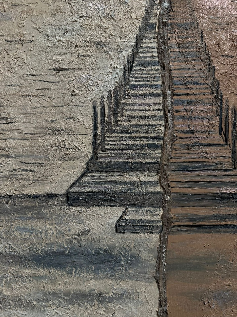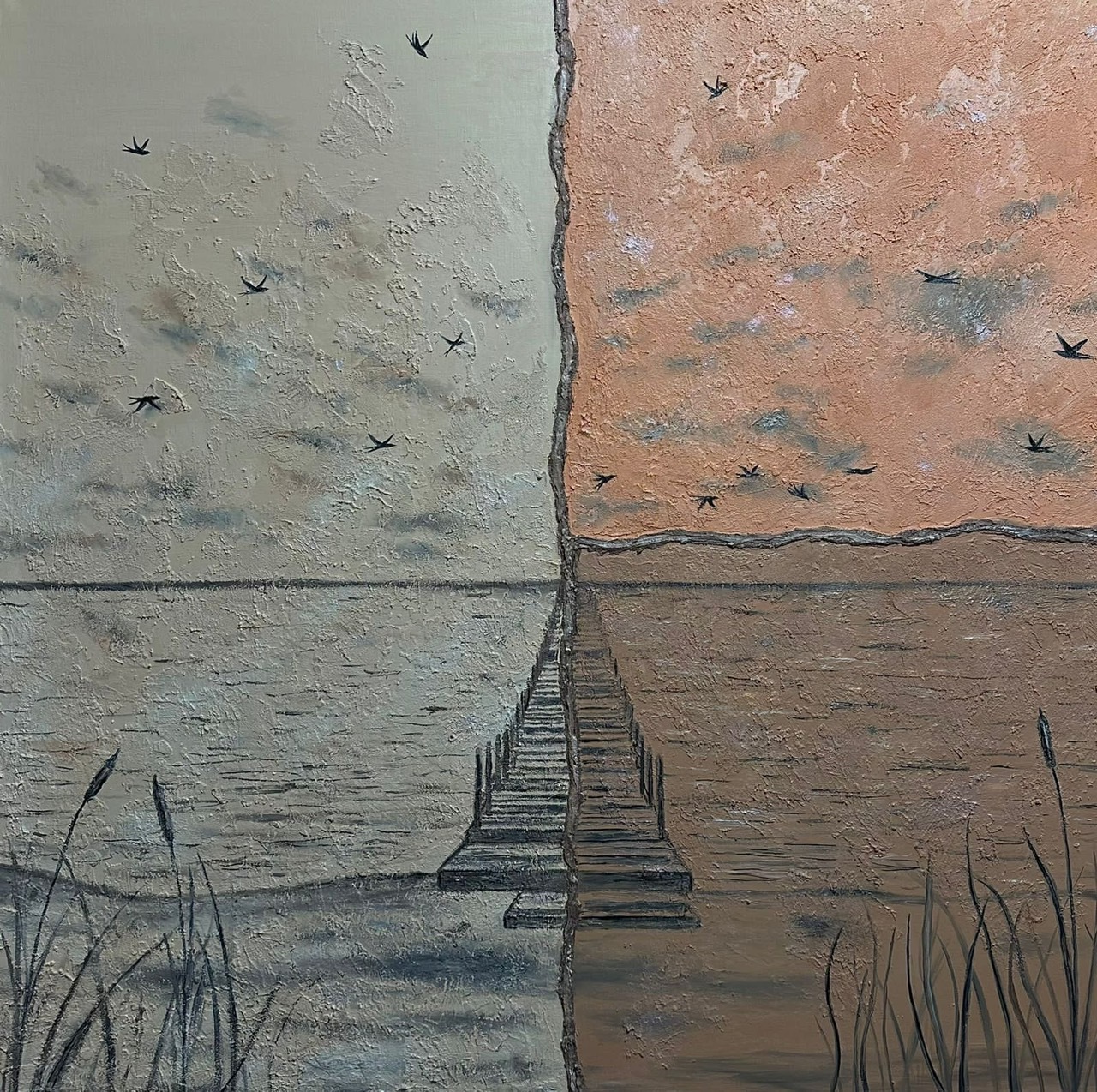 Как часто, следуя уверенно по жизни, как по прочному и ровному мосту, изображенному на полотне, человек становится перед сложным выбором. Это может быть, ситуация, вынуждающая и подталкивающая к действиям, которые могут круто изменить его жизнь. В какую именно из сторон безграничного пространства будет совершен прыжок, и будет очень сильно зависеть дальнейший путь. Плавать ли в светлых водах, спокойно наслаждаясь спокойствием штиля или поднимая голову ввысь, наблюдать за движением птиц, или устремиться всем своим естеством в яркое, раскаленное и наполненное подстерегающих опасных препятствий пространство, или опуститься в рутинную, темную и казалось бы спокойную морскую гладь, решать конечно же человеку. Но оставаясь на мосту, можно просто замерзнуть или умереть от жажды и зноя. Только двигаясь вперед и совершая прыжки, можно обрести свободу и жизнь. И какой бы она не была, главное, никогда не жалеть что выбор был сделан самостоятельно.