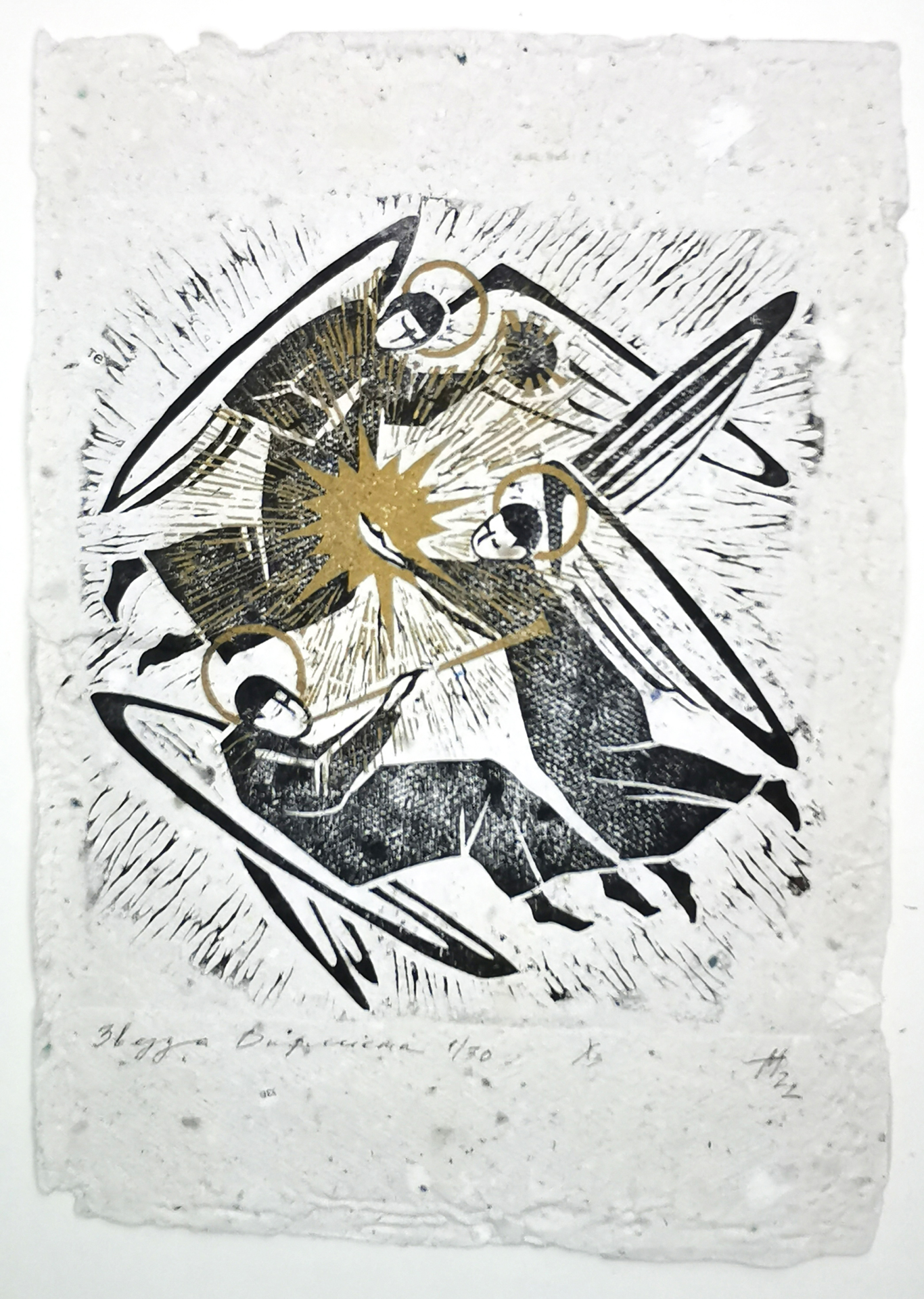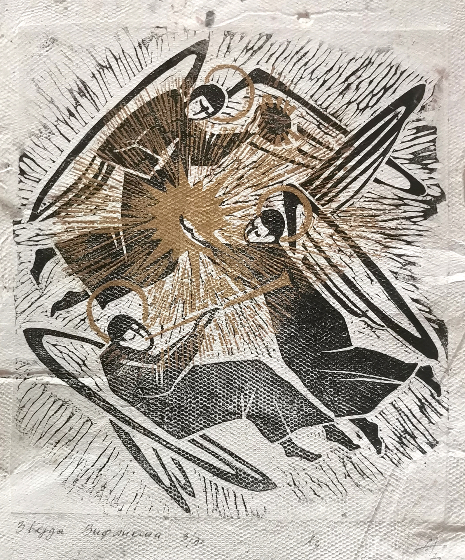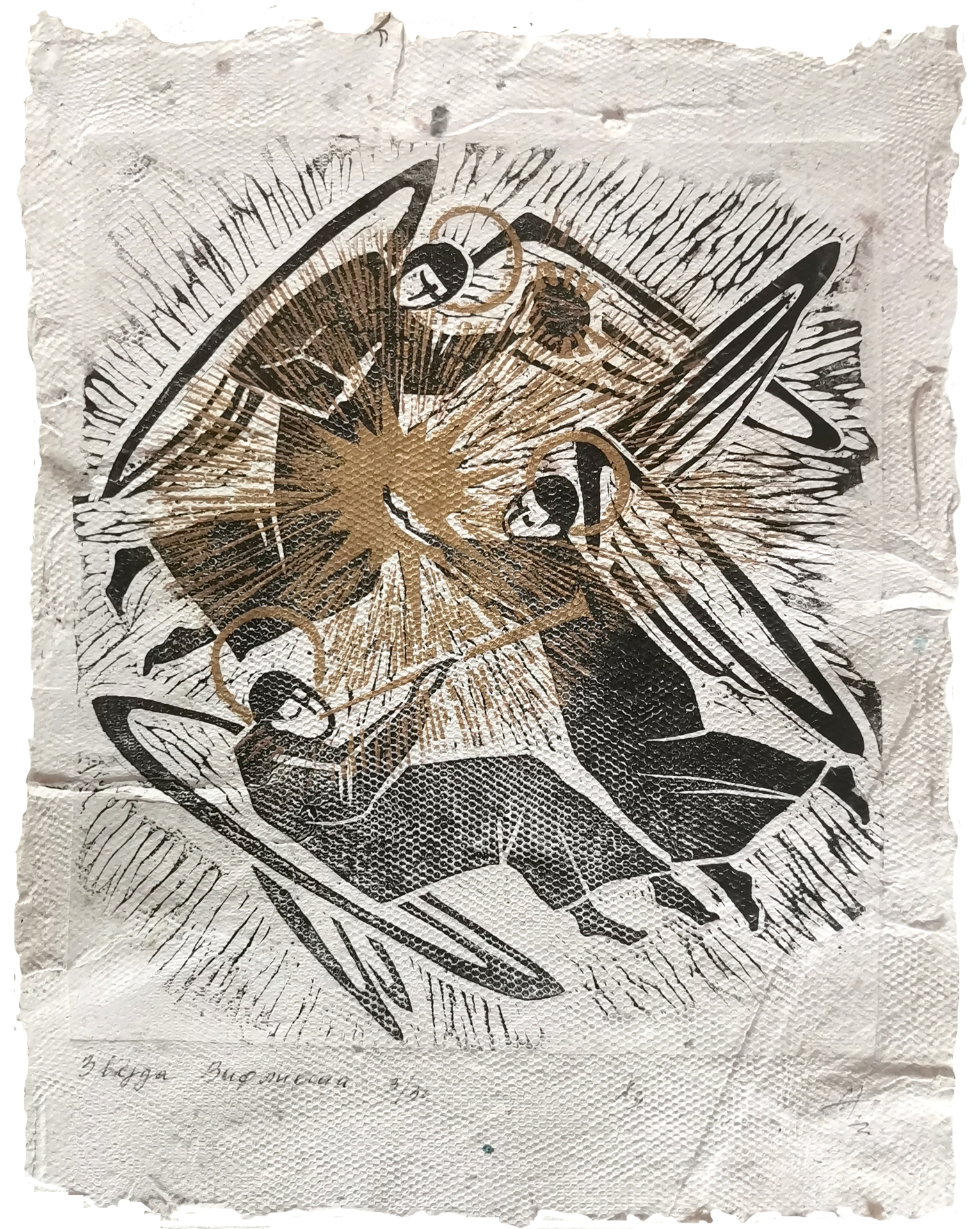 РОттиски выполнены на бумаге ручной работы, поэтому размеры листов колеблятя в районе 2 см. Оттиск двумя красками черная и золото. Так же есть оттиски на цветной бумаге и бумаге Эрбу