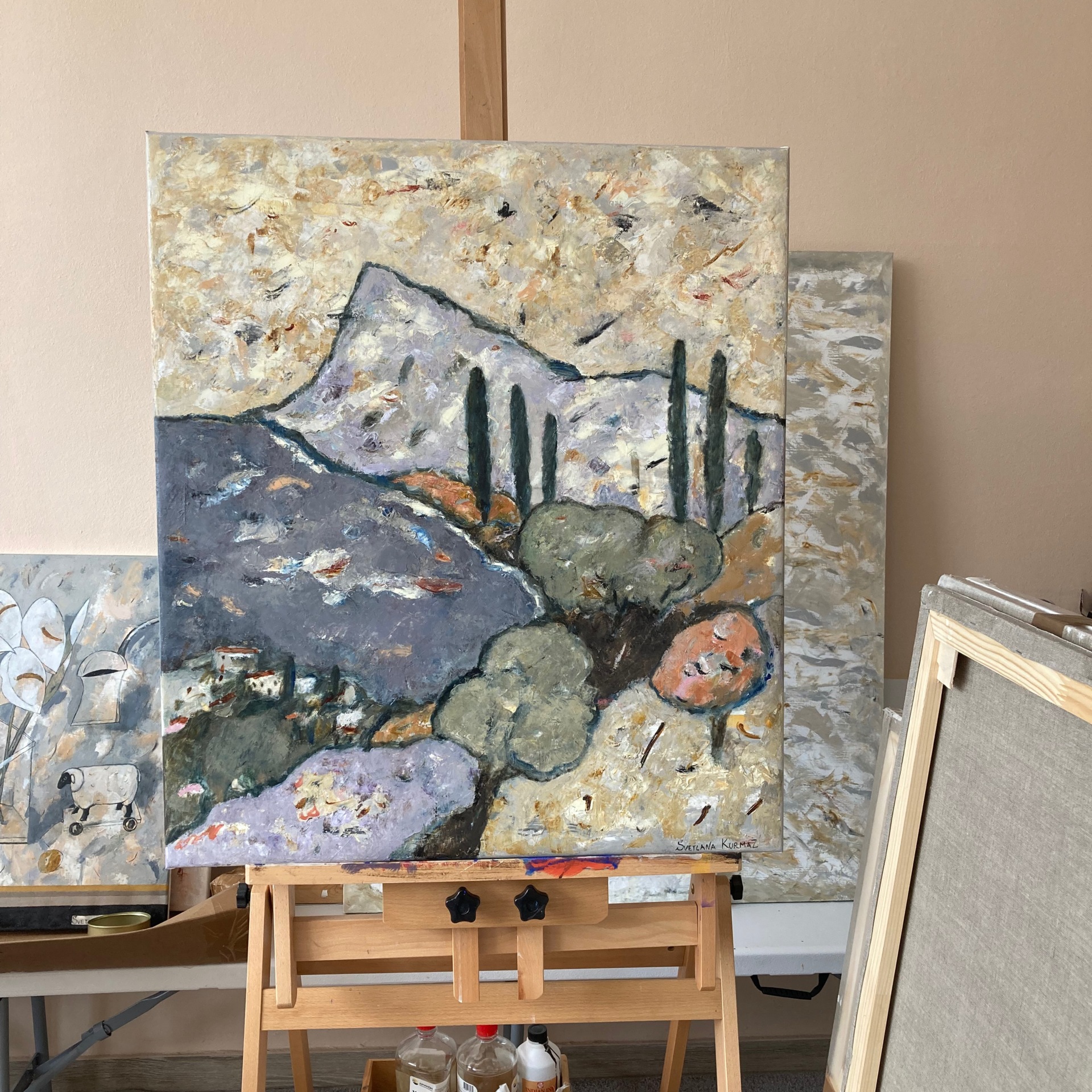 Пейзаж написан по впечатлениям от поездок на Греческий остров Родос. Картина написана мастихином в экспрессионистической манере с эстетическими отголосками стиля Модерн, который присутствует практически во всех моих фигуративных картинах. Мягкий, условный колорит и точный композиционный ход картины позволяет ее разместить на стене с возможностью отхода на достаточно большое расстояние. Все детали касательно приобретения работы можно обсудить в личном общении через Вотсапп.
