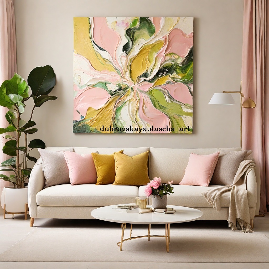 Современная гостиная с большой, яркой абстрактной картиной, выполненной из текстурной пасты, акриловых красок и эпоксидной смолы, в центре внимания. Картина установленная на стене над кремовым диваном, демонстрирует динамичное сочетание закрученных цветов, включая нежно-розовый, нежно-желтый, лаймово-зеленый и белый, создавая ощущение движения и энергии, с цветами магнолии. Диван украшен множеством подушек нейтральных тонов и мягкой желтой декоративной подушкой. Слева от дивана находится элегантный золотой торшер с белым абажуром и небольшой приставной столик с растением в горшке и декоративным элементом. Справа: высокое зеленое растение в фактурном горшке добавляет в пространство нотку природы. Комната хорошо освещена естественным светом, исходящим из невидимого источника, подчеркивая цвета и детали произведений искусства и мебели. Contemporary living room with a large, vibrant abstract painting made from texture paste, acrylic paints and epoxy resin taking center stage. The mounted on the wall above the cream-colored sofa, showcases a dynamic combination of swirling colors including soft pink, soft yellow, lime green and white, creating a sense of movement and energy, with magnolia flowers. The sofa is decorated with plenty of cushions in neutral tones and a soft yellow throw pillow. To the left of the sofa is an elegant gold floor lamp with a white shade and a small side table with a potted plant and a decorative item. Right: A tall green plant in a textured pot adds a touch of nature to the space. The room is well lit with natural light coming from an unseen source, highlighting the colors and details of the artwork and furniture.
