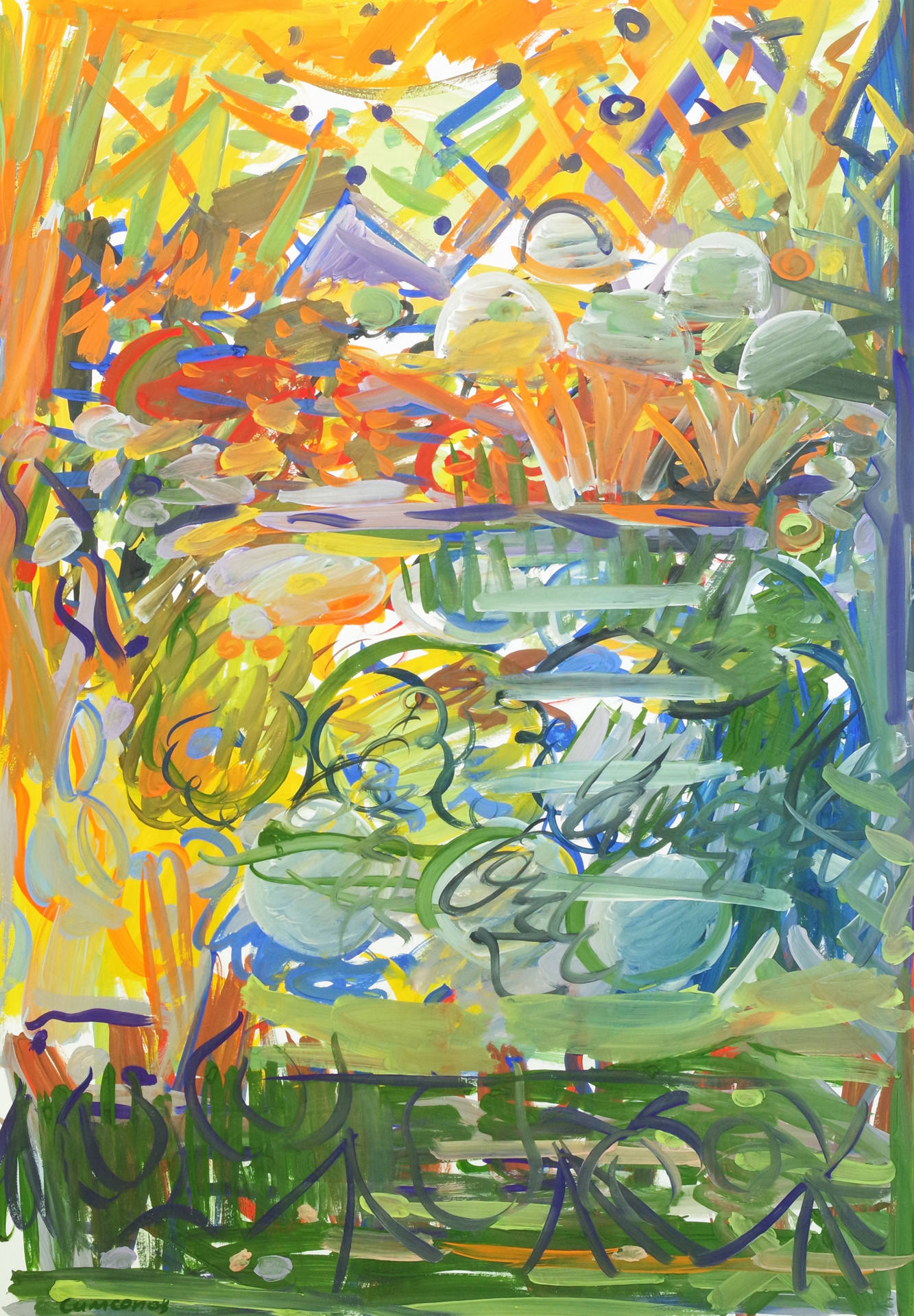 Работа исполнена в стиле Абстрактного экспрессионизма, на бумаге, гуашью.
