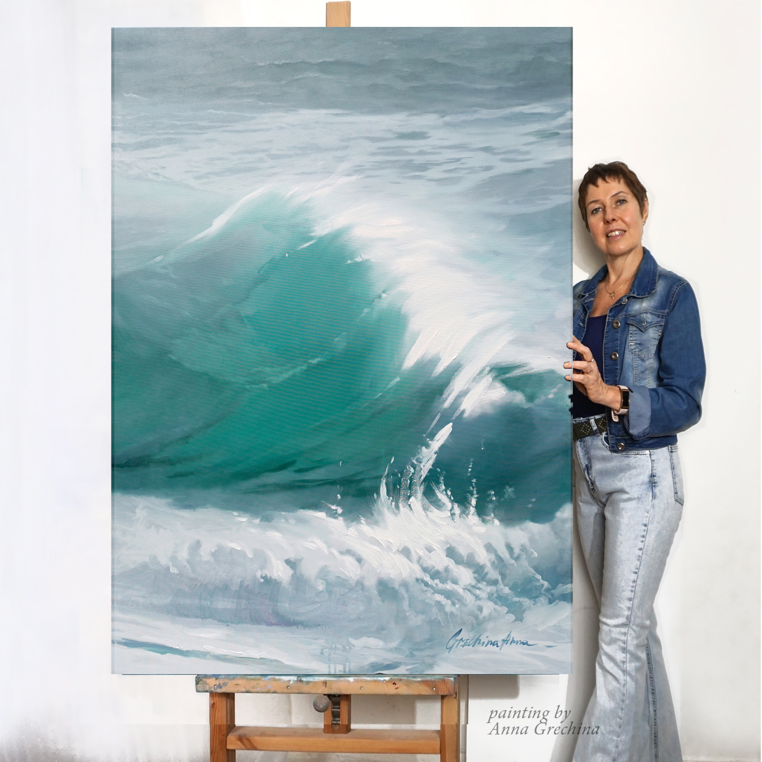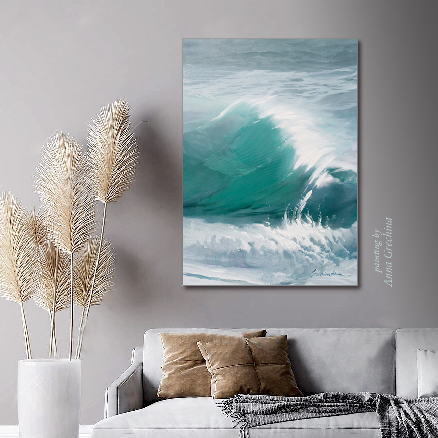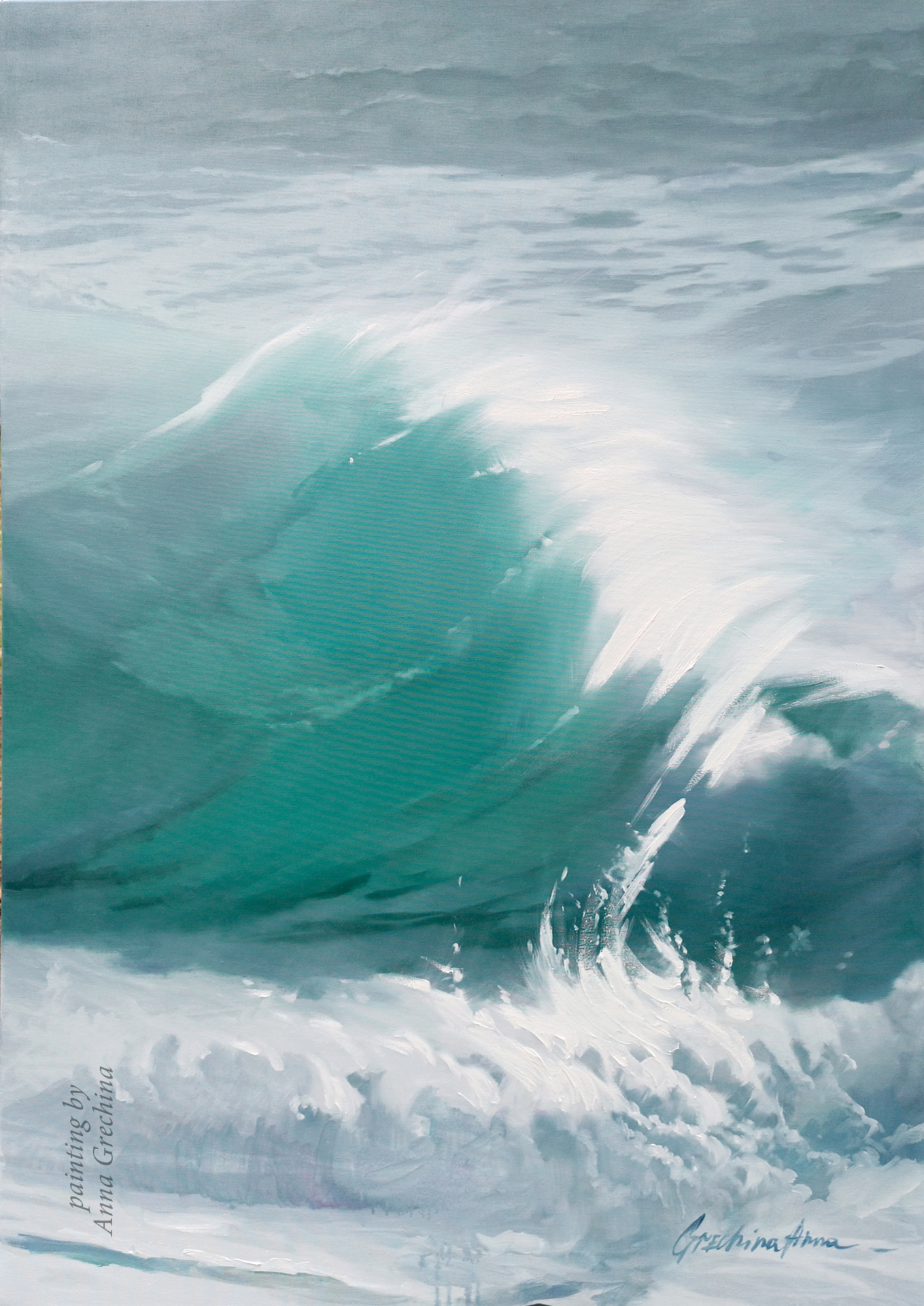 Картина Волна. --- Авторская живопись. Используются высококачественные художественные масляные краски, испанский холст, сборный подрамник, покрывной лак Winsor&Newton. ПОКУПКА. --- ПОКУПКА КАРТИНЫ В МАСТЕРСКОЙ: Все работы вы можете посмотреть и приобрести у меня в мастерской в г. Москва, район Отрадное, по предварительной договоренности. --- ПРИМЕРКА КАРТИНЫ ON-LINE – в подарок! * (по желанию, возможно изготовление эскиза –привязки картины в фотографию интерьера покупателя.) --- ОПЛАТА: 100% суммы перед отправкой картины покупателю. --- ДОСТАВКА: для пересылки в другой город работа надежно упаковывается по технологии европейских и американских художественных интернет-магазинов и может быть отправлена в коробе или тубусе. Почтовые и транспортные компании согласовываются с покупателем индивидуально. Стоимость почтовых и транспортных перевозок, а так же перевозку картин для примерки в интерьере, оплачивает покупатель. --- ПРИМЕРКА В ИНТЕРЬЕРЕ: Для жителей Москвы есть возможность примерки картин в интерьере. --- КАРТИНЫ НА ЗАКАЗ: по желанию заказчика, я могу сделать повтор своей работы в другом размере, если это нужно для интерьера. Срок изготовления заказов от 2х месяцев, точное повторение невозможно. При выполнении заказа берется аванс. Стоимость заказа и сумма аванса обговаривается индивидуально. --- Для отправки картины в другое государство возможно изготовление сертификата на вывоз от Министерства культуры Российской Федерации.