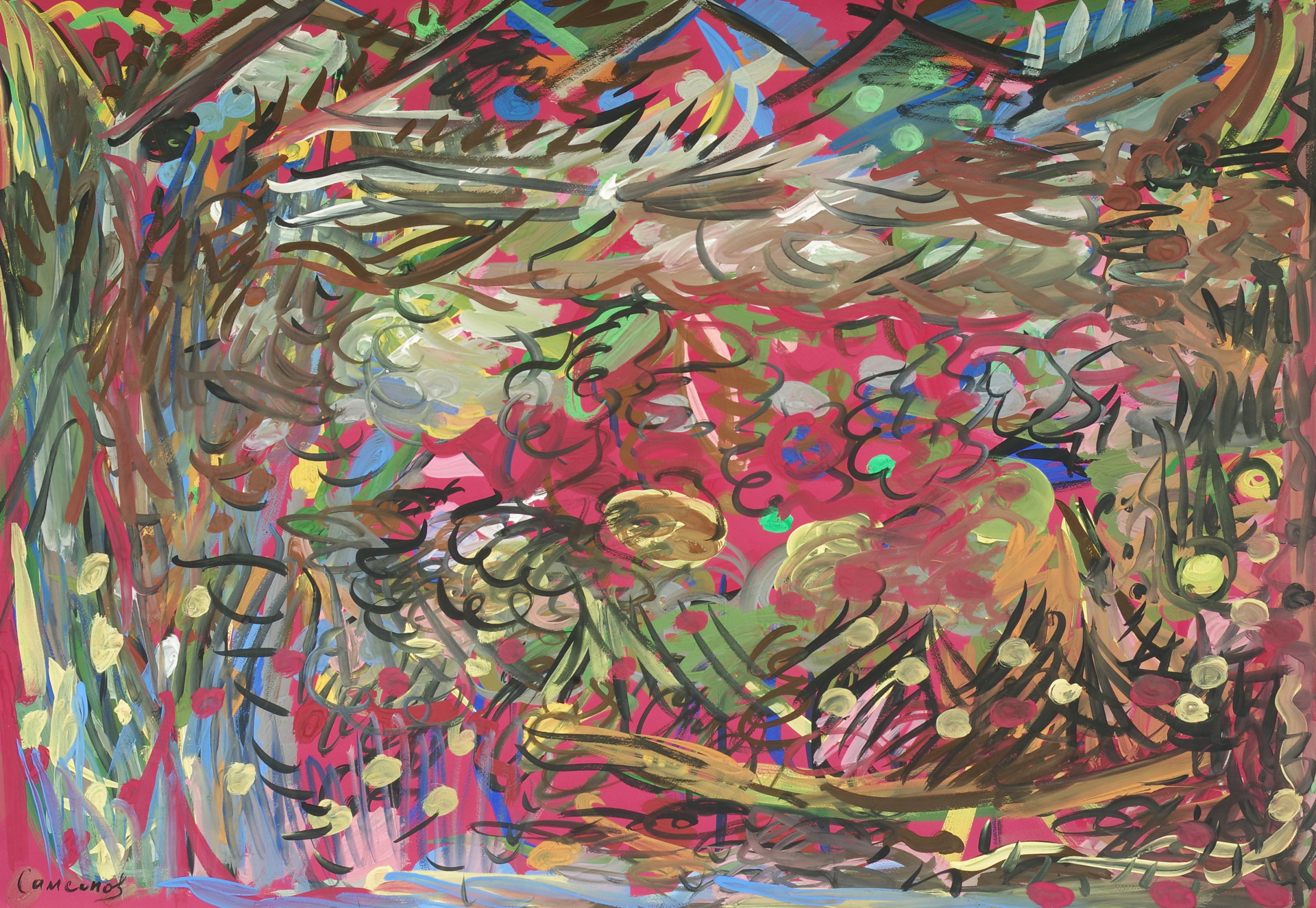 Работа исполнена в стиле Абстрактного экспрессионизма, на цветной бумаге, гуашью.