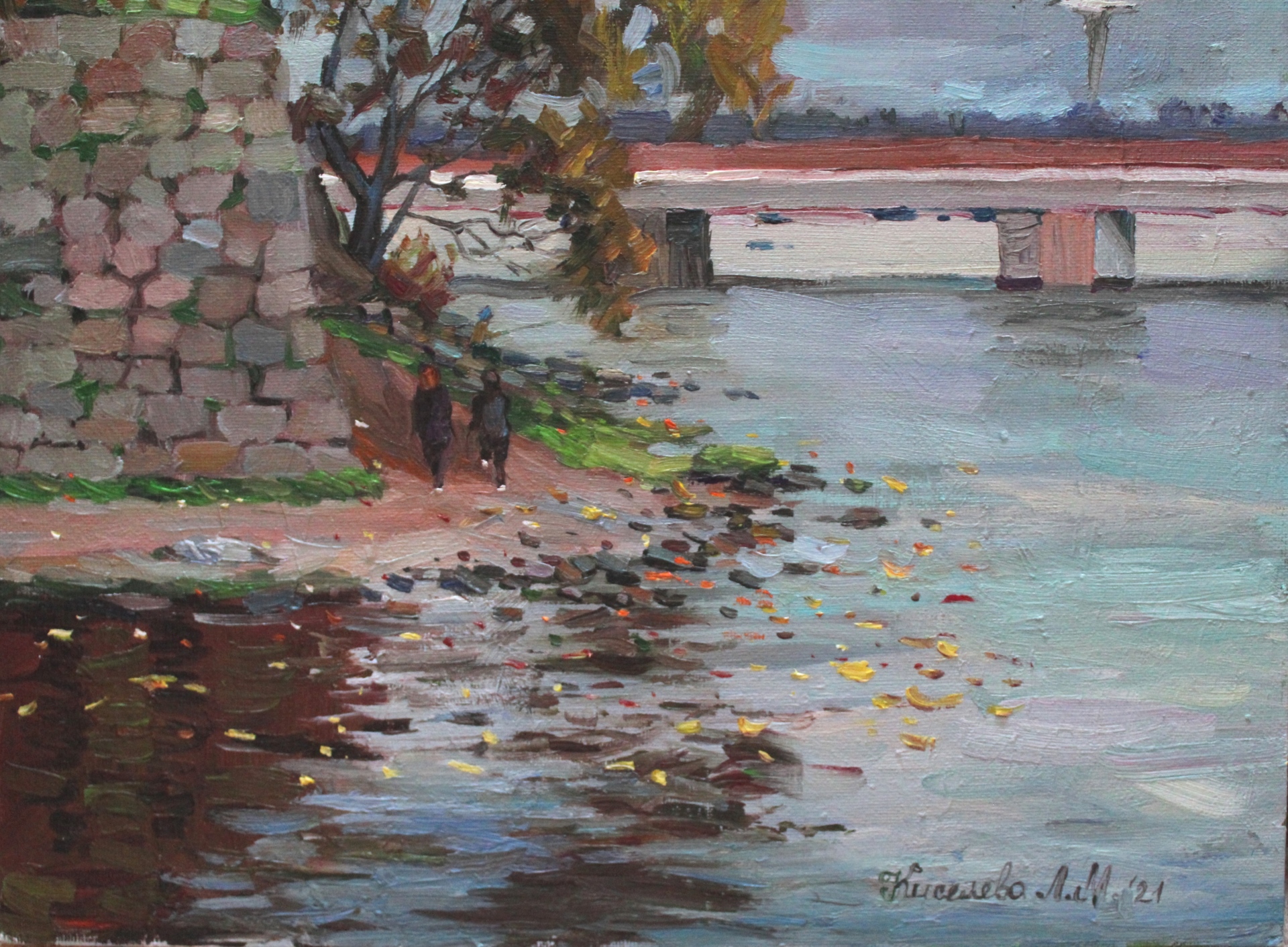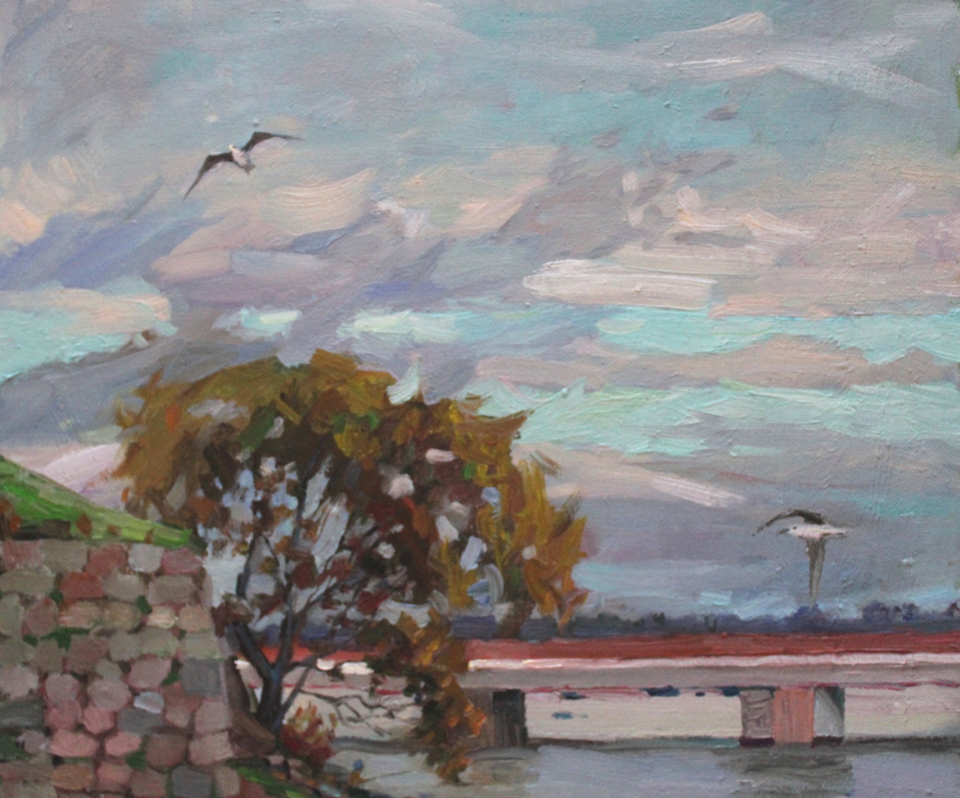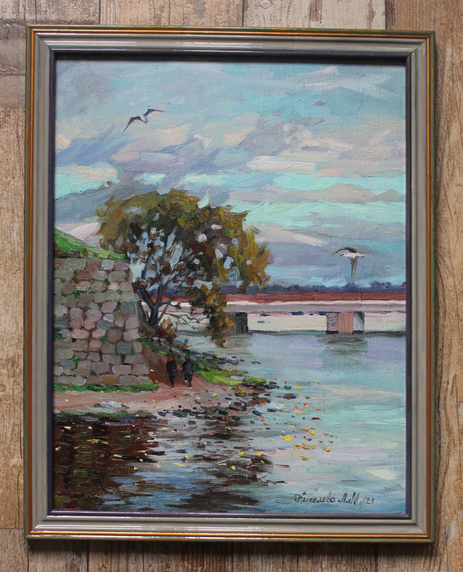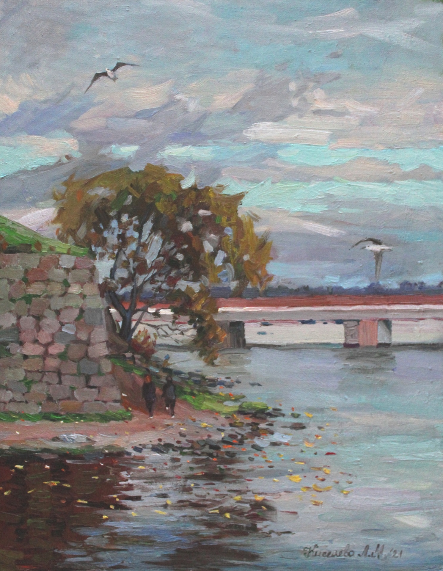 Картина написана на холсте наклеенном на картон, оформлена в раму, покрыта лаком. Вид на Петровский мост и Северную гавань.