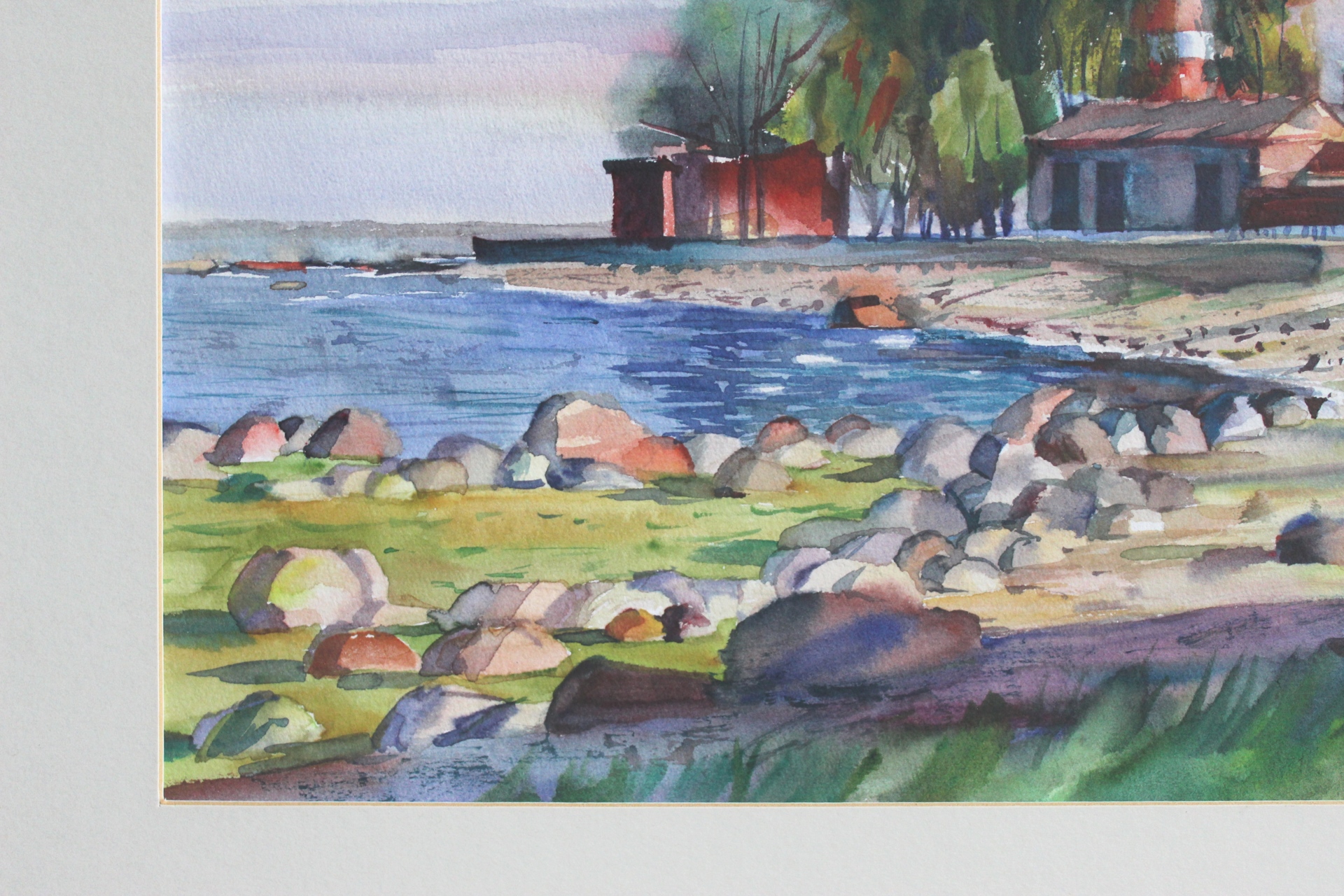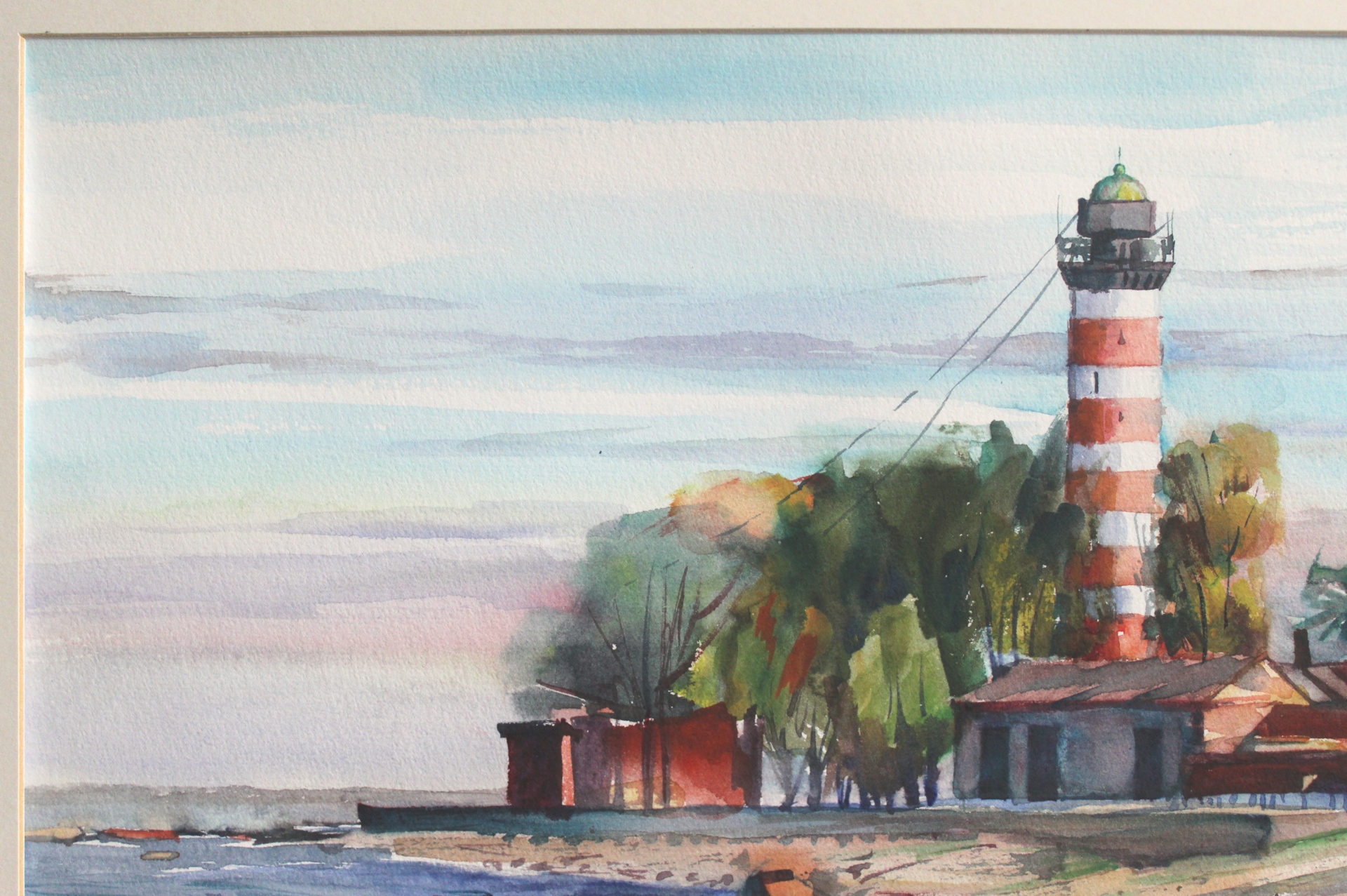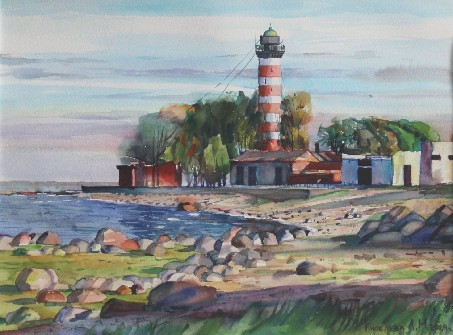 Шепелёвский маяк расположен на южном берегу Финского залива на Шепелёвском мысу небольшого полуострова Гора Валдай, что в полутора километрах к северо-западу от деревни Шепелёво. Маяк представляет собой круглую кирпичную башню высотой 38 метров, выкрашенную горизонтальными красными и белыми полосами. На вершине башни находится чёрного цвета галерея и фонарь. Лист 30х40, в раме 40х50.
