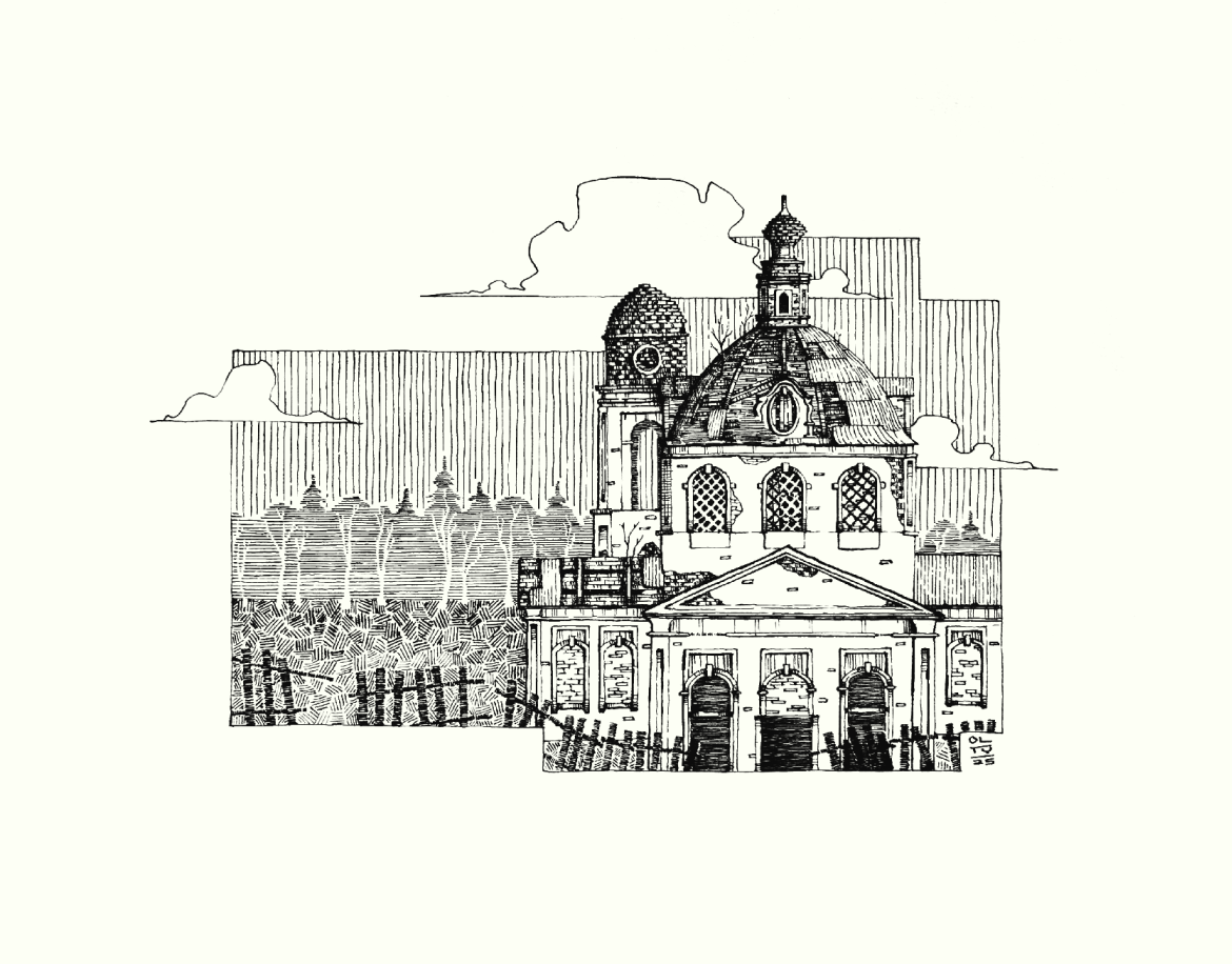 «кто остался между вами, который видел этот дом в прежней его славе, и каким видите вы его теперь? Не есть ли он в глазах ваших как бы ничто?» [Агг 2:3] Графический лист из серии «Здесь был Бог» Работы серии изображают заброшенные руины храмов, представляющие собой символ противостояния человека, как созидателя, разрушительным силам природы и неизбежного поражения его в итоге этой борьбы. Хаосу можно упорно сопротивляться, но его нельзя победить, смерть не преодолеть, и даже сама Вселенная прекратит однажды своё существование. И тем не менее, человек и его творения стойко противостоят времени и разрушению. В этой графической работе я пытался запечатлеть момент утраты, момент, когда величие прошлого контрастирует с упадком настоящего. Руины церкви - это не просто разрушенное здание, это символ ушедшей эпохи, о которой мы можем только вспоминать.