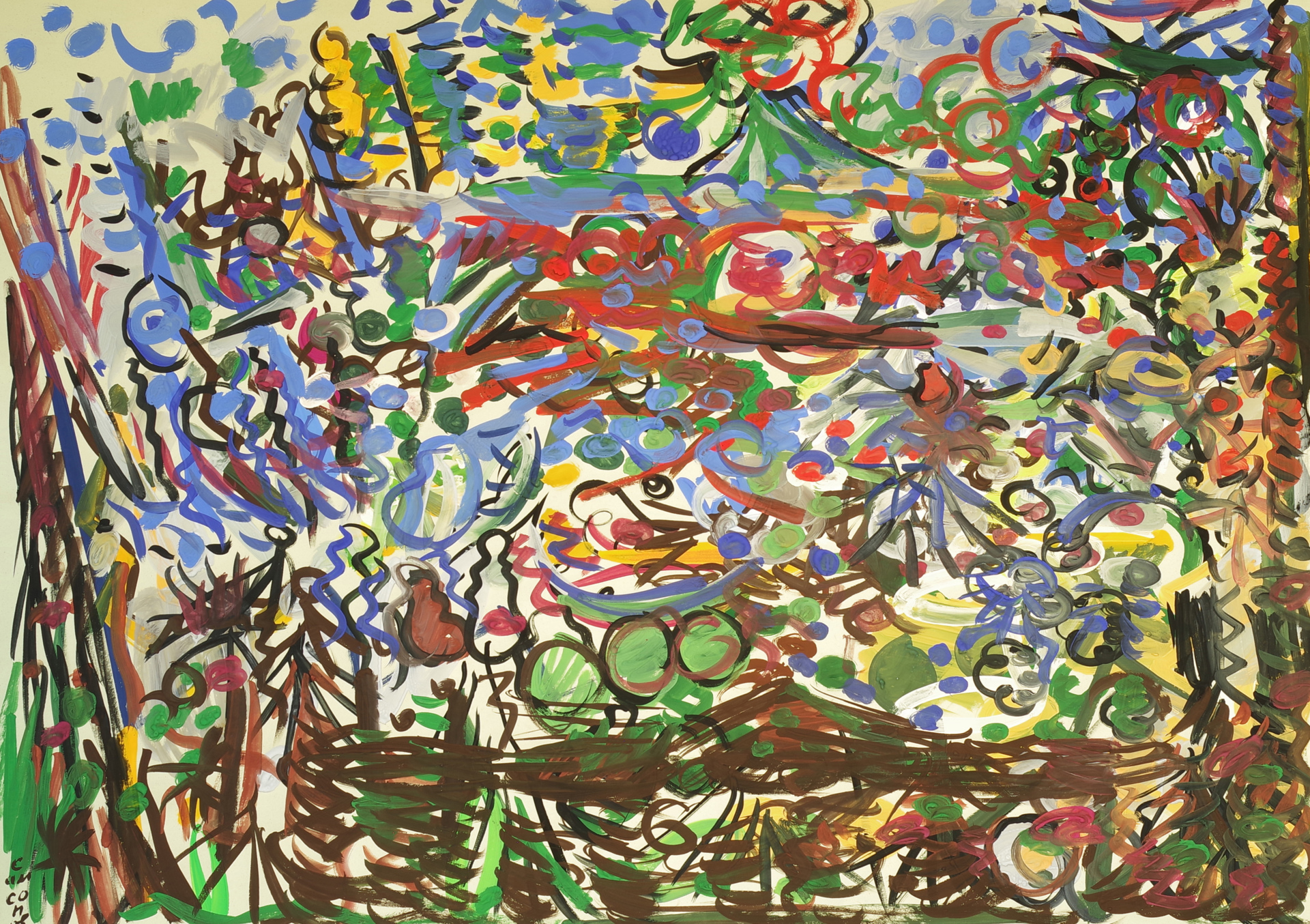 Работа исполнена в стиле Абстрактного экспрессионизма, на цветной бумаге, гуашью.