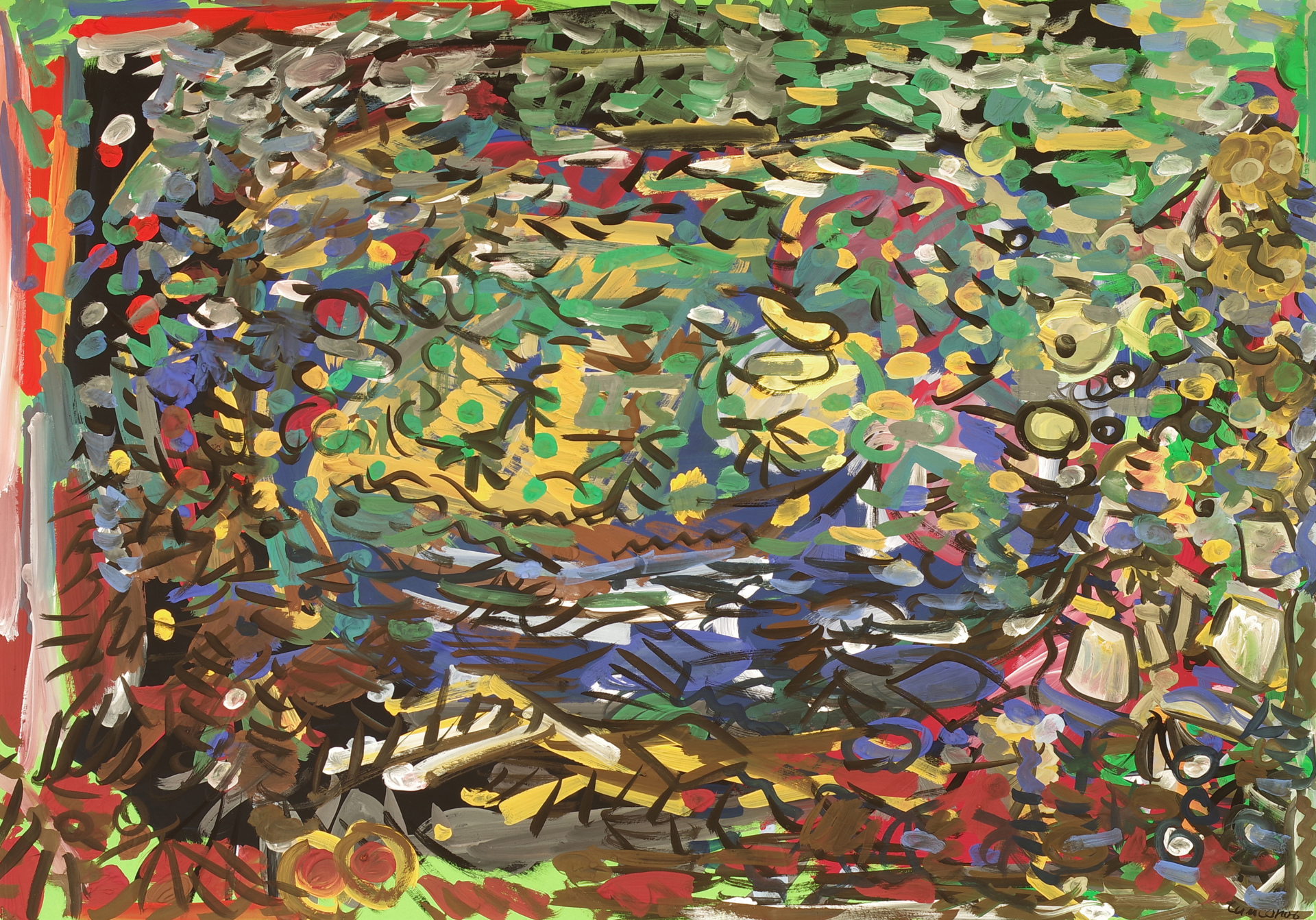Работа исполнена в стиле Абстрактного экспрессионизма, на цветной бумаге, гуашью.