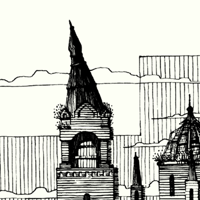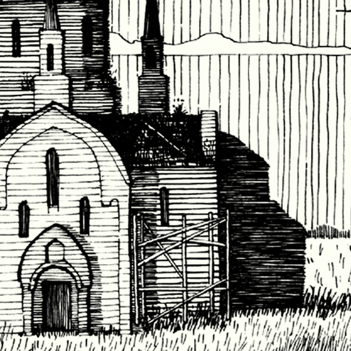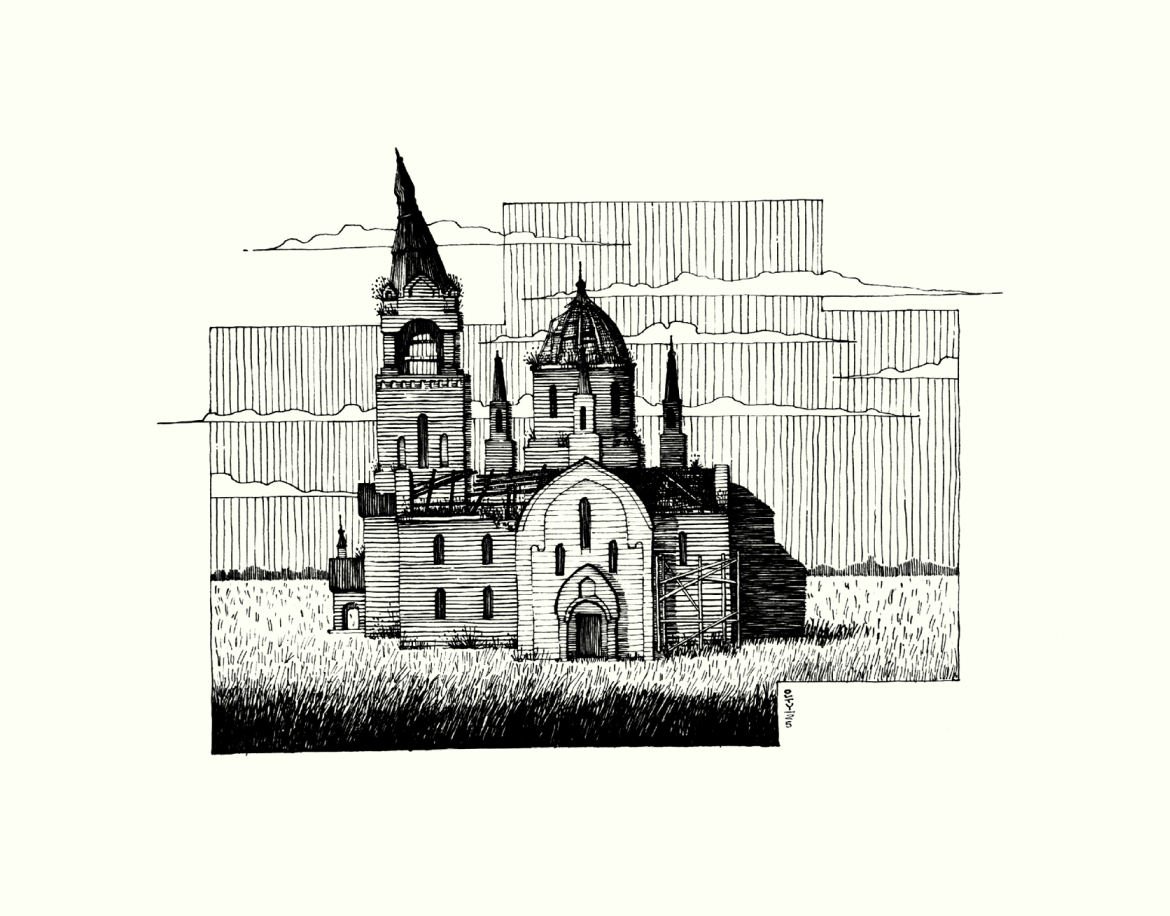 «что осталось от гусеницы, то съела саранча; что осталось от саранчи, то съел пруг; а что осталось от пруга, то доела кобылка» [Иоиль 1:4] Графический лист из серии «Здесь был Бог» Работы серии изображают заброшенные руины храмов, представляющие собой символ противостояния человека, как созидателя, разрушительным силам природы и неизбежного поражения его в итоге этой борьбы. Хаосу можно упорно сопротивляться, но его нельзя победить, смерть не преодолеть, и даже сама Вселенная прекратит однажды своё существование. И тем не менее, человек и его творения стойко противостоят времени и разрушению. Изображение разрушенной церкви на фоне поля. Здание храма частично разрушено: отсутствует шпиль на колокольне, видны следы времени и разрушения. Однако, несмотря на это, церковь сохраняет свой архитектурный стиль и величие. На переднем плане - поле травы, создающее ощущение заброшенности и уединения.