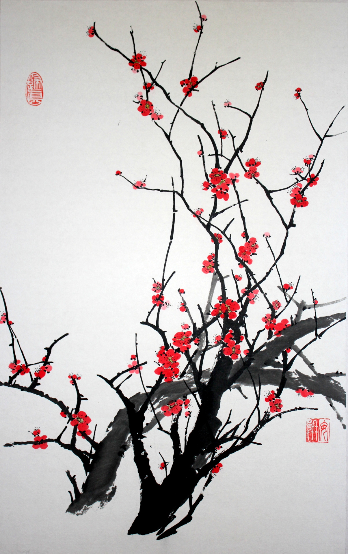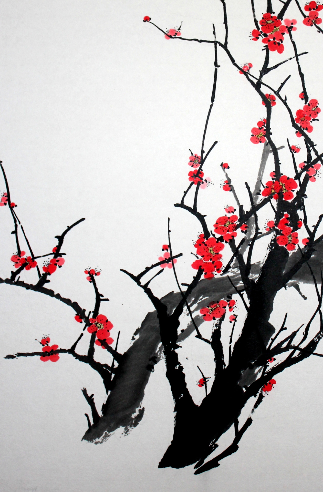 Яркая эмоциональная картина с цветущей дикой сливой выполнена в традициях китайской живописи го хуа на рисовой бумаге минеральными красками и черной тушью. Две традиционные красные печати - овальная "чувствуй душой" и квадратная с именем автора. продается без оформления в багет