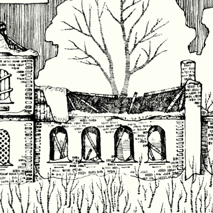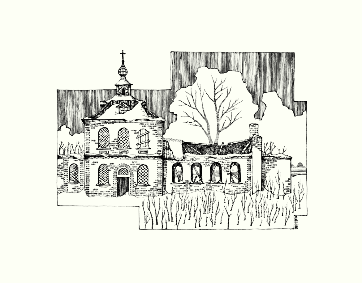 «терние и волчцы вырастут на жертвенниках их, и скажут они горам: покройте нас, и холмам: падите на нас!» [Ос. 10:8] Графический лист из серии «Здесь был Бог» Работы серии изображают заброшенные руины храмов, представляющие собой символ противостояния человека, как созидателя, разрушительным силам природы и неизбежного поражения его в итоге этой борьбы. Хаосу можно упорно сопротивляться, но его нельзя победить, смерть не преодолеть, и даже сама Вселенная прекратит однажды своё существование. И тем не менее, человек и его творения стойко противостоят времени и разрушению. Разрушенная церковь, поглощенная природой, становится свидетельством о бренности всего земного. Заколоченные окна и рухнувшая крыша подчеркивают трагизм и запустение.