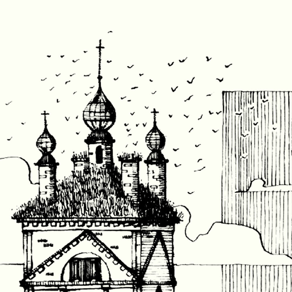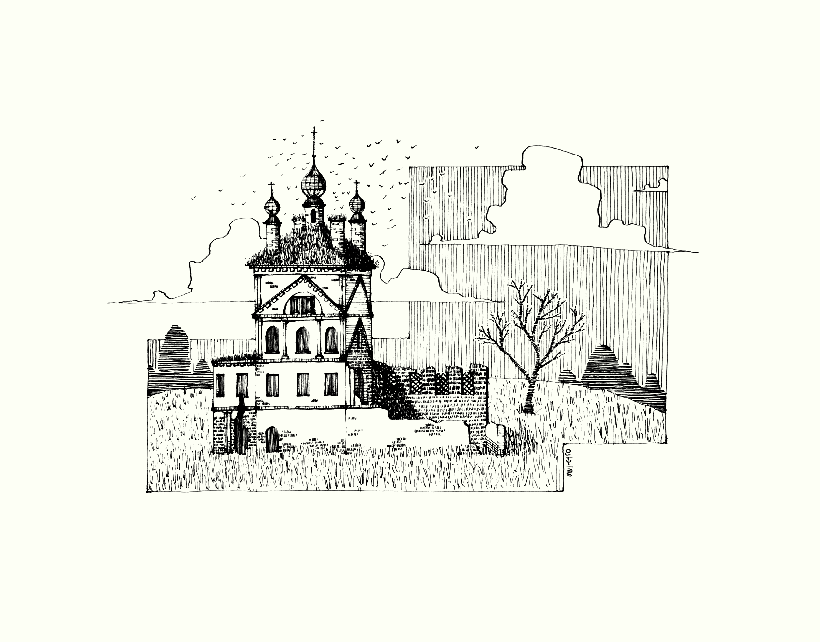 «Я так же поступлю с домом сим, над которым наречено имя Моё, на который вы надеетесь, и с местом, которое Я дал вам и отцам вашим, как поступил с Силомом.» [Иер 7:14] Графический лист из серии «Здесь был Бог» Работы серии изображают заброшенные руины храмов, представляющие собой символ противостояния человека, как созидателя, разрушительным силам природы и неизбежного поражения его в итоге этой борьбы. Хаосу можно упорно сопротивляться, но его нельзя победить, смерть не преодолеть, и даже сама Вселенная прекратит однажды своё существование. И тем не менее, человек и его творения стойко противостоят времени и разрушению. Разрушенная церковь, символизирует утраченную веру, забвение духовных ценностей, упадок, а также олицетворяет хрупкость человеческого бытия и неизбежность разрушения под влиянием времени. Птицы, кружащие над куполом символизируют душу, свободу, полет. Их присутствие над разрушенной церковью может говорить о том, что даже в упадке остается надежда на возрождение и духовное просветление.