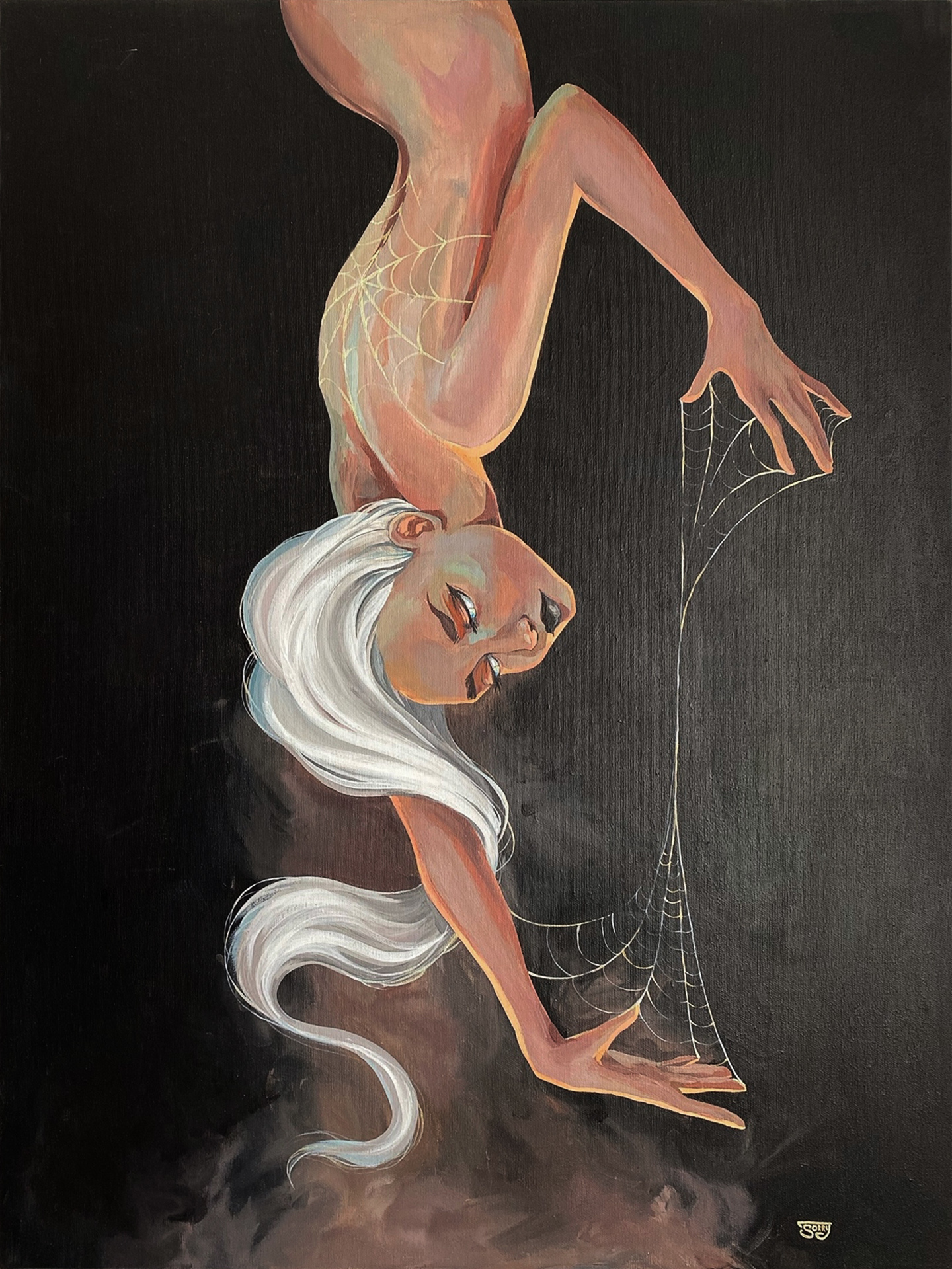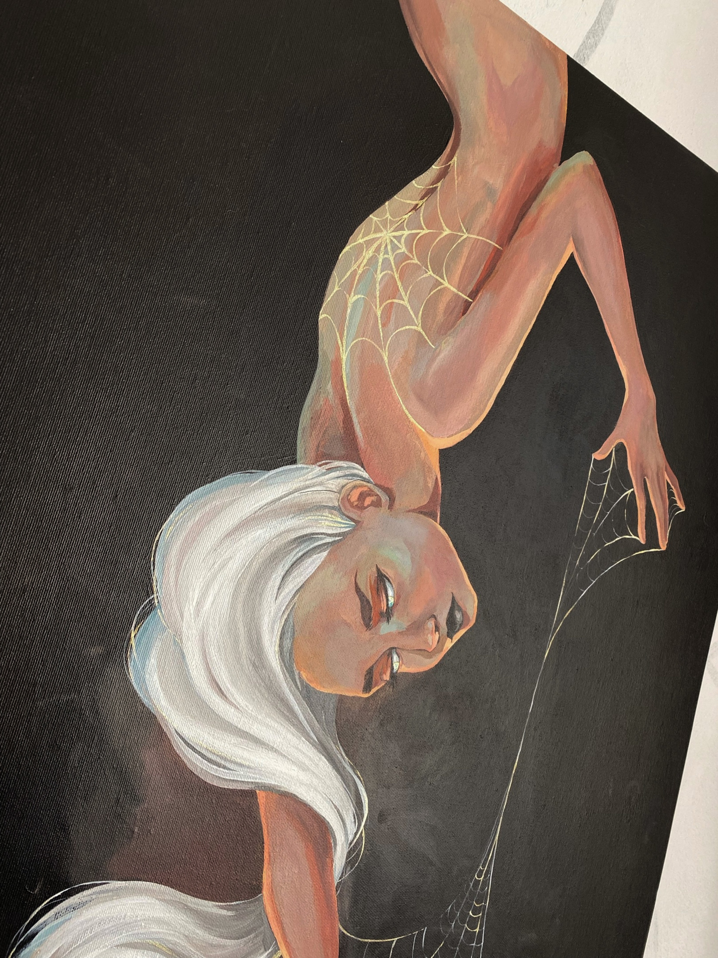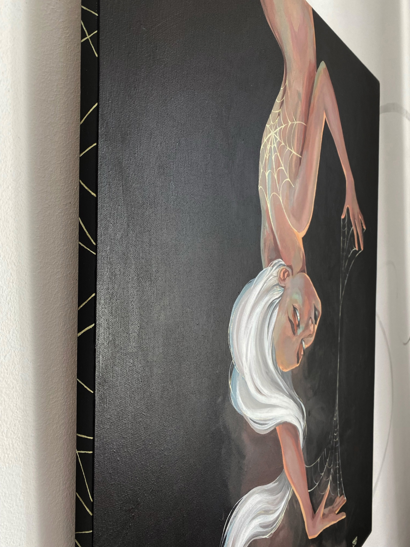 При создании работы использовалась краска-хамелеон. Детали волос, паутины и другие детали (рисунок на спине) становятся видны лишь под определённым углом