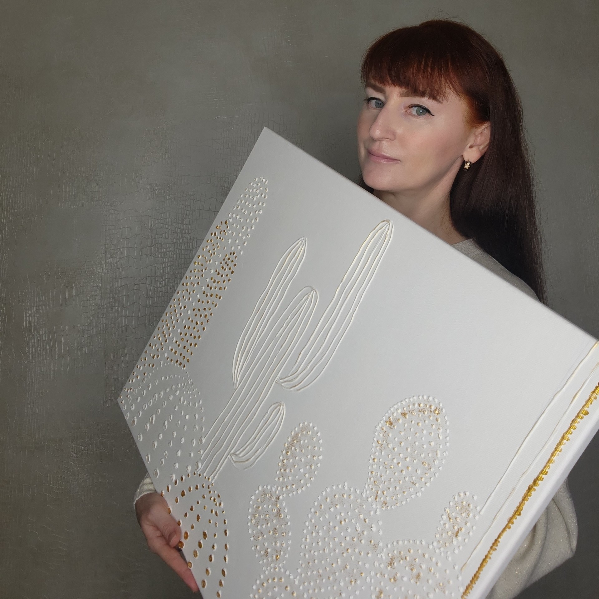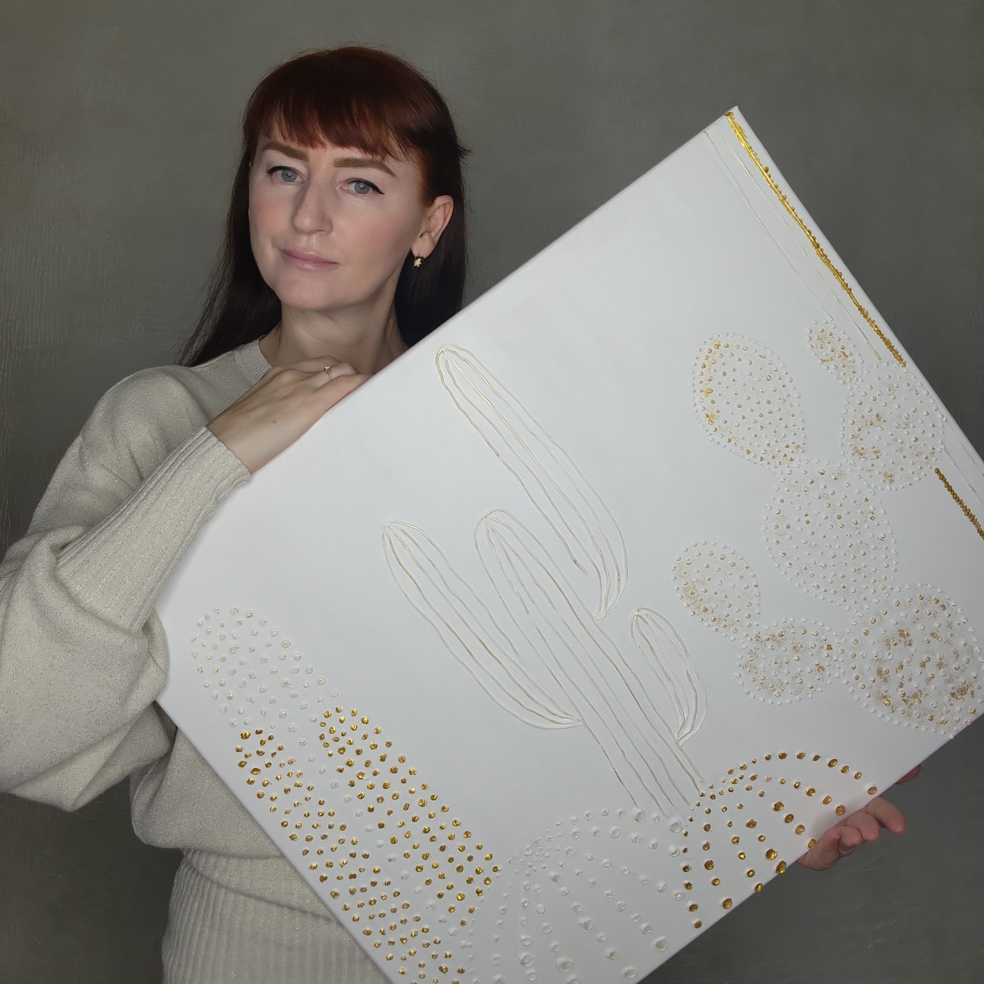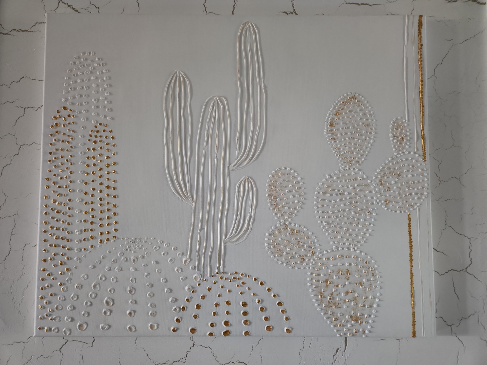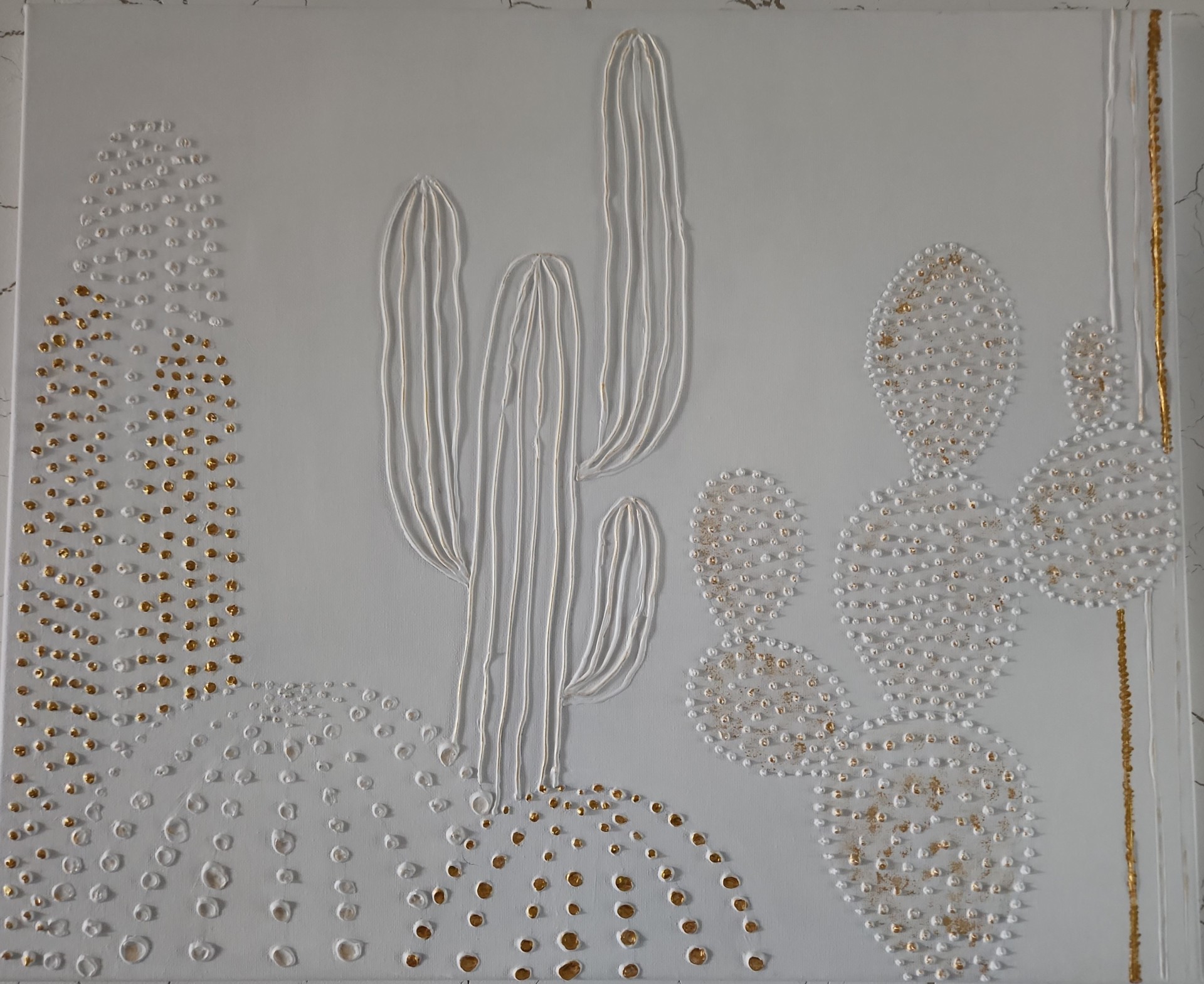 Выполненная в минималистичном белом цвете, картина привлекает внимание благодаря объёмному изображению кактусов различной формы. Для выделения объема и придания особого шарма кактусам использована золотая акриловая краска. Эти золотые штрихи добавляют роскошь и глубину, создавая игру света и тени, которая меняется в зависимости от освещения. Картина добавит пространству нотки минимализма, элегантности и современности.