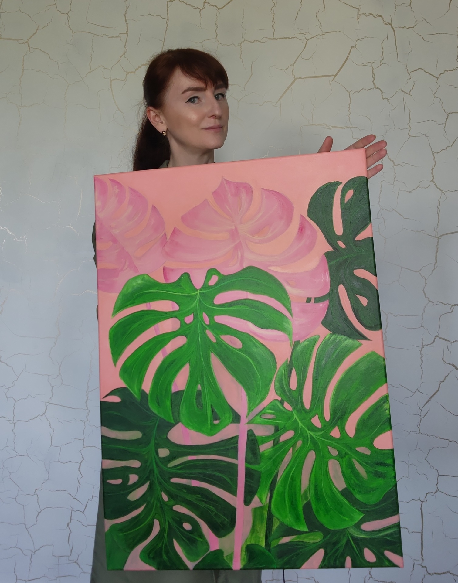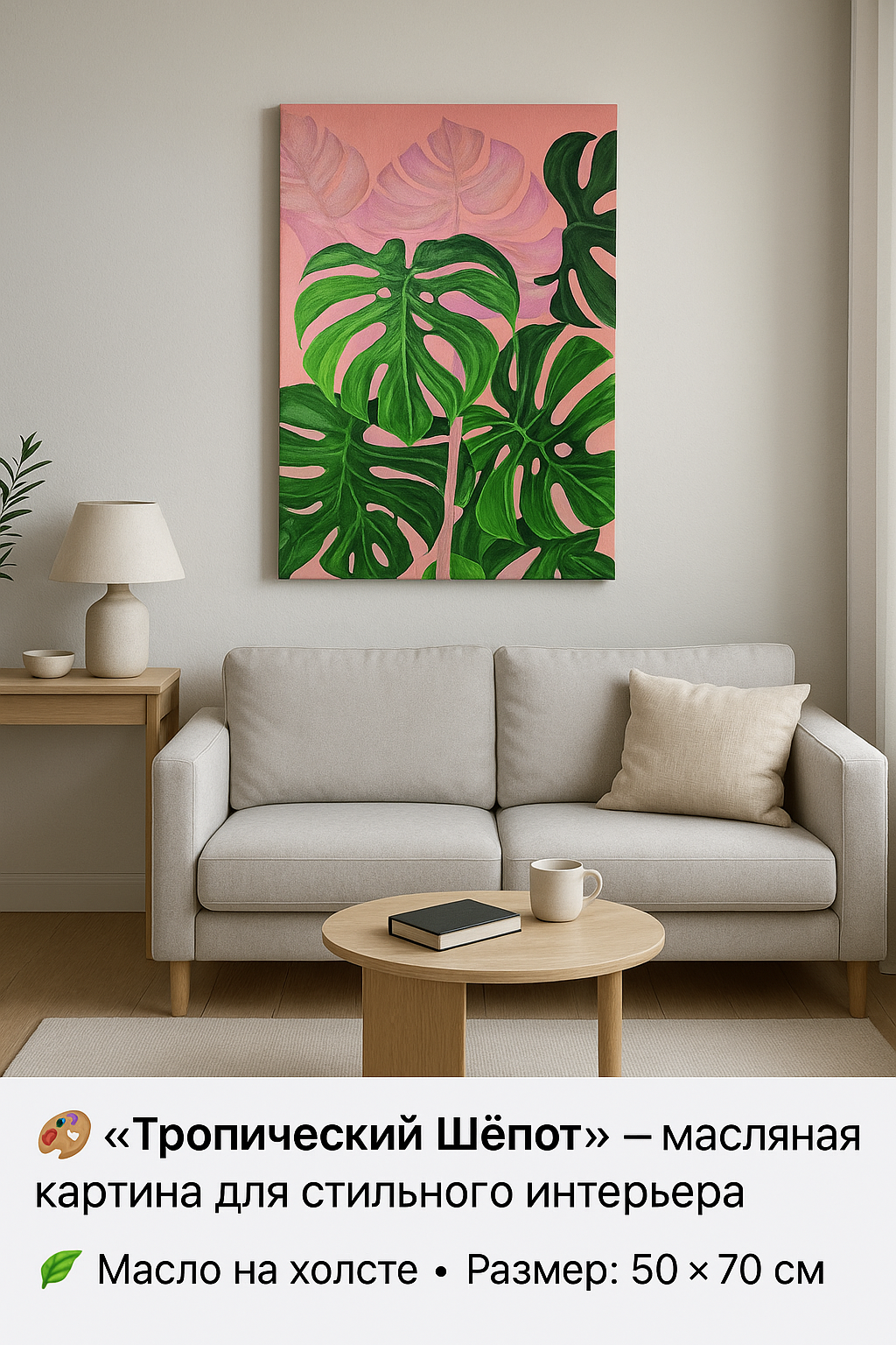 Погрузитесь в атмосферу экзотики с картиной "Тропический Шёпот". Энергичные мазки, насыщенные зелёные оттенки и гармоничный контраст с розовым фоном создают эффект присутствия в оазисе спокойствия и вдохновения. ? Масло на холсте — глубокая текстура, живая игра света и цвета ? Размер: 50 × 70 см — идеальный формат для гостиной, спальни или кабинета ? Вдохновение: листья монстеры как символ роста, силы и природной красоты ? Подходит как для личного вдохновения, так и в качестве стильного подарка Добавьте в свой дом произведение искусства, которое говорит о вкусе, свежести и внутренней гармонии.