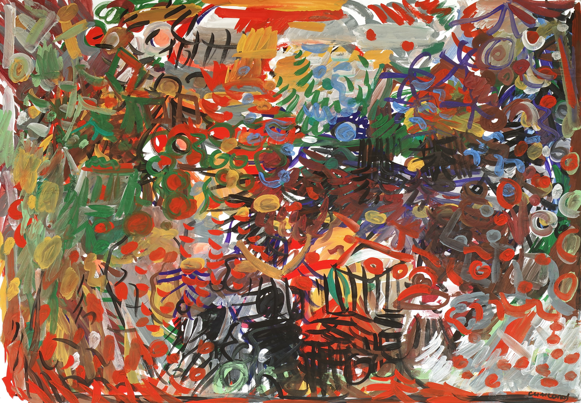 Работа исполнена в стиле Абстрактного экспрессионизма, на бумаге, гуашью.