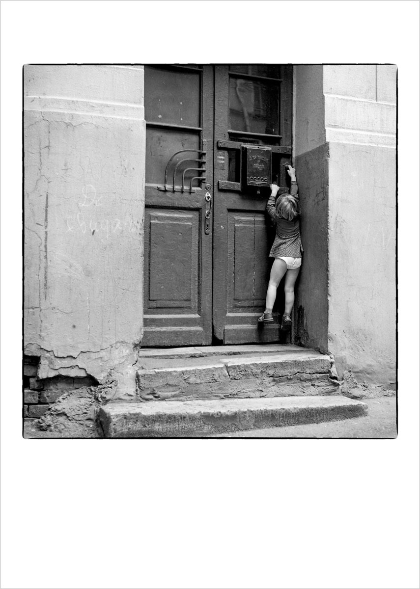 Вернувшись с прогулки, девочка тянется к замку на двери. Авторский принт с оцифрованного негатива на плотной матовой бумаге с подписью фотографа на обороте.