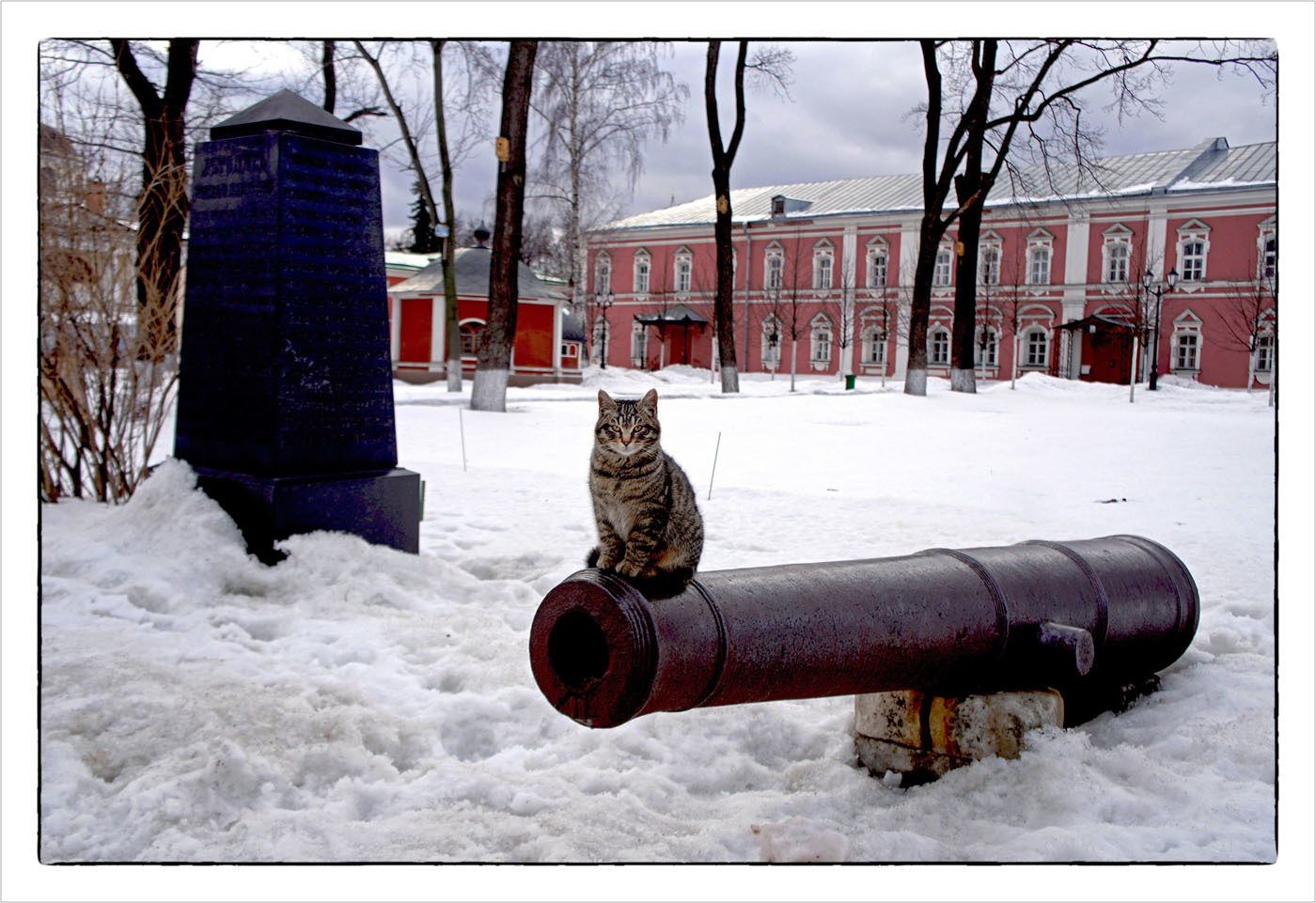 Кот, сидящий на стволе старинной пушки