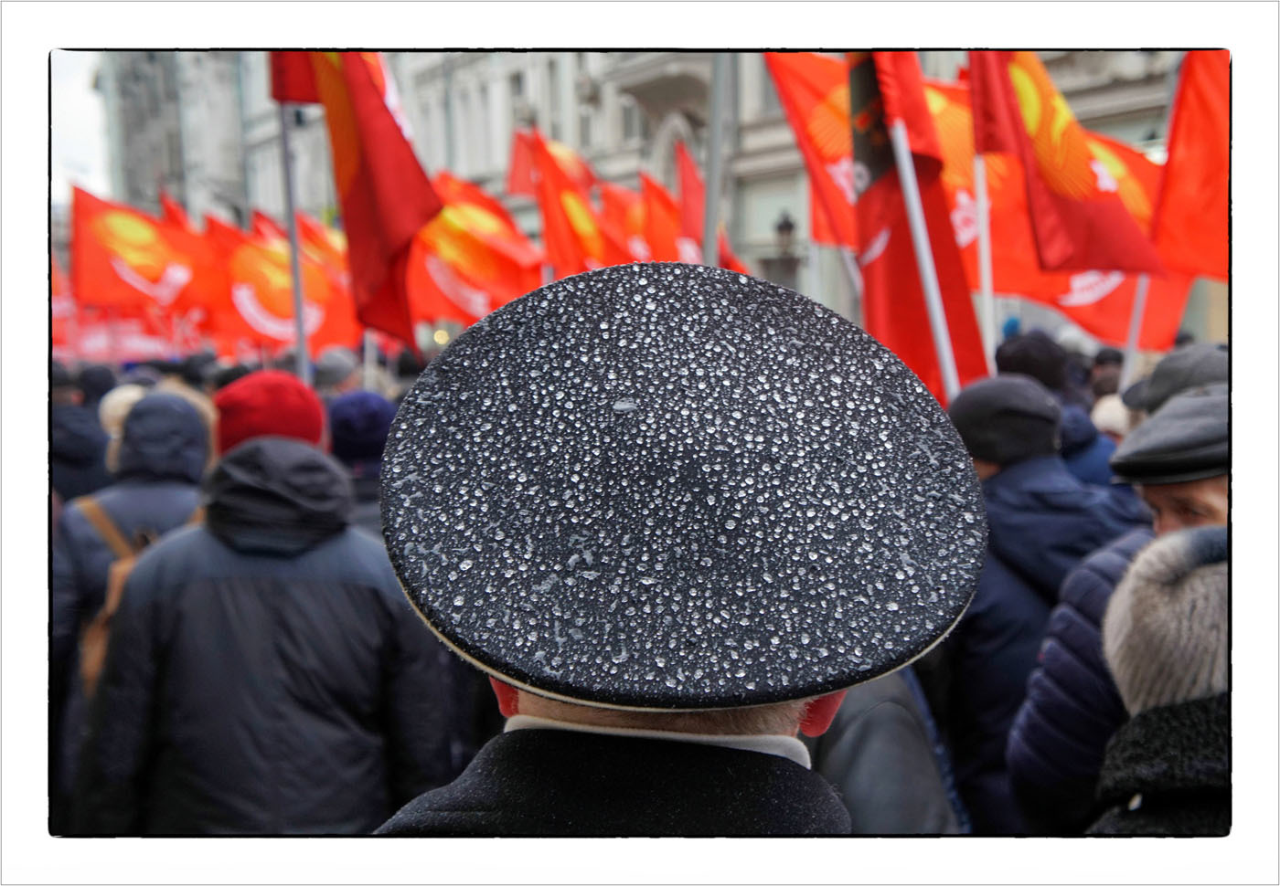 Снимок сделан в Москве во время ноябрьской демонстрации. Тающие снежинки превращаются в капли на фуражке одного из участников. Напечатан на плотной матовой бумаге с подписью автора на обороте.