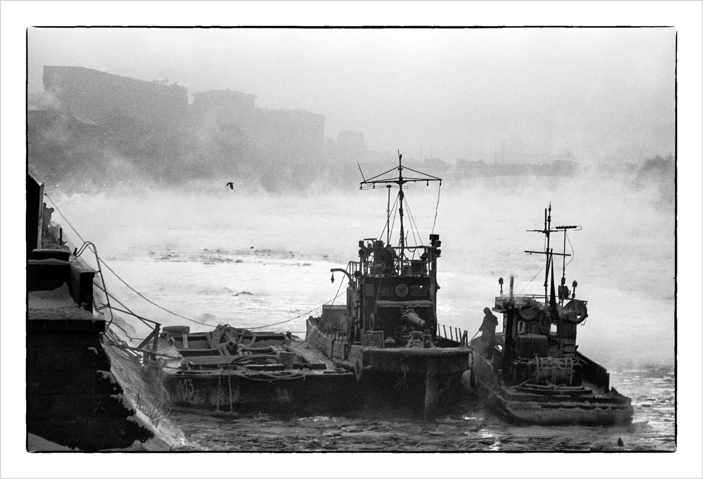 Снимок сделан с Большого Устьинского моста. Над замёрзшей водой поднимается пар. Авторский принт с оцифрованного негатива, на обороте - подпись фотографа.
