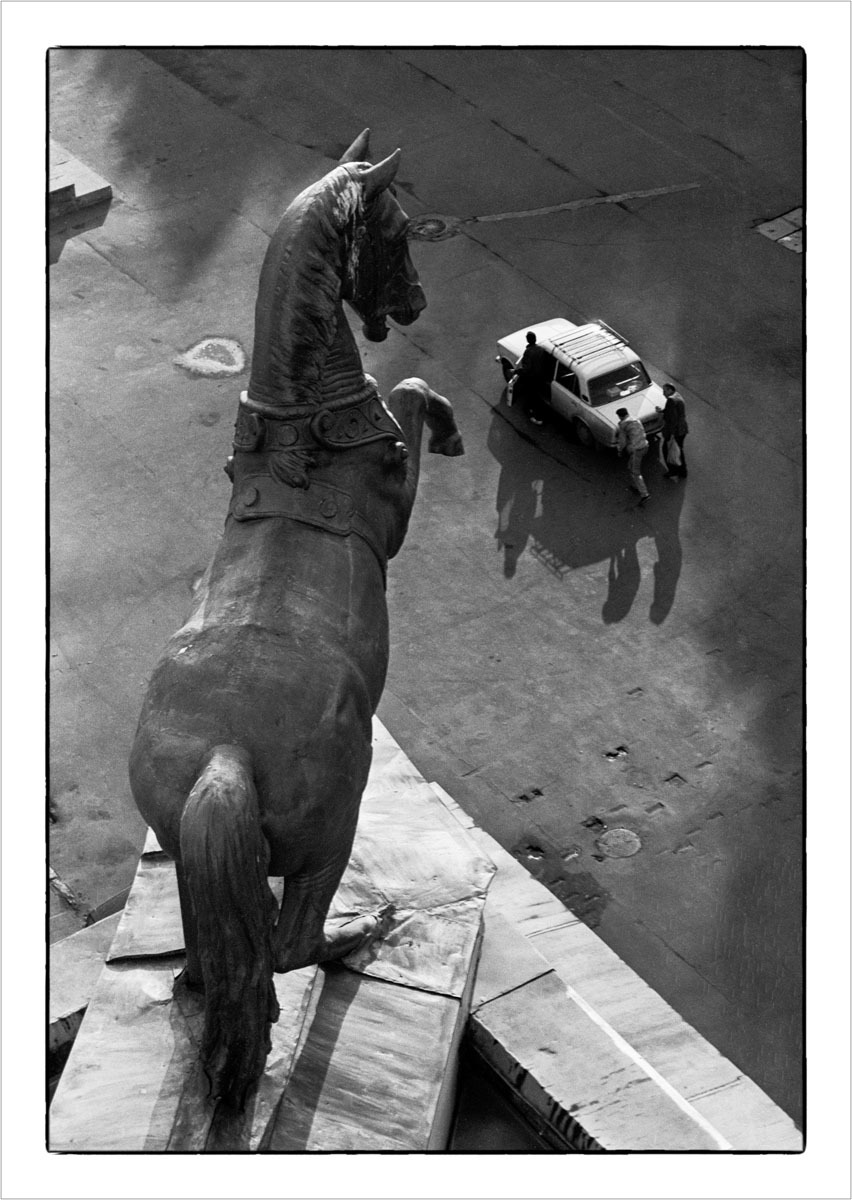 Снимок сделан в Москве с крыши Центрального ипподрома. Под скульптурой вздыбленного коня люди толкают заглохший автомобиль "Жигули". Авторский принт с оцифрованного негатива с подписью фотографа на обороте.