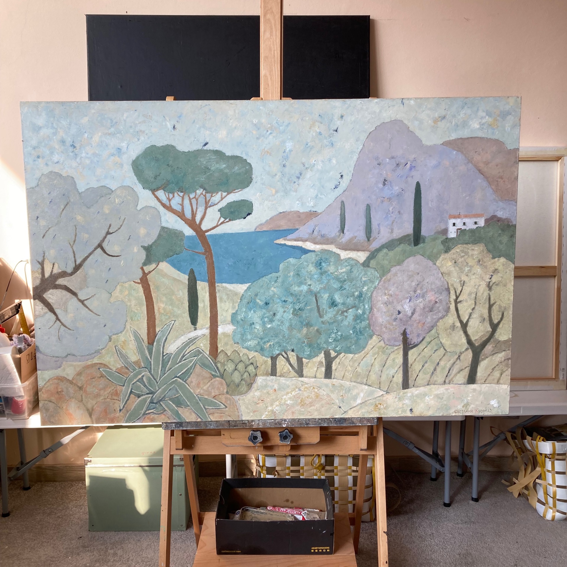 Картина из серии "Сентиментальное путешествие", написанной по мотивам воспоминаний жизни в Тоскане, поездок на Адриатическое и Эгейское моря, на Ибицу и побережье Атлантического океана в районе г. Аркашон. Выраженный горизонтальный формат позволяет разместить картину над диваном или тумбой в прихожей. А мягкий колорит будет удачно сочетаться практически с любым интерьером. Работа выполнена в современном авторском стиле и авторской технике. Картина находится в студии художника. Ее можно приобрести, связавшись в Вотсап и выяснив все интересующие детали.