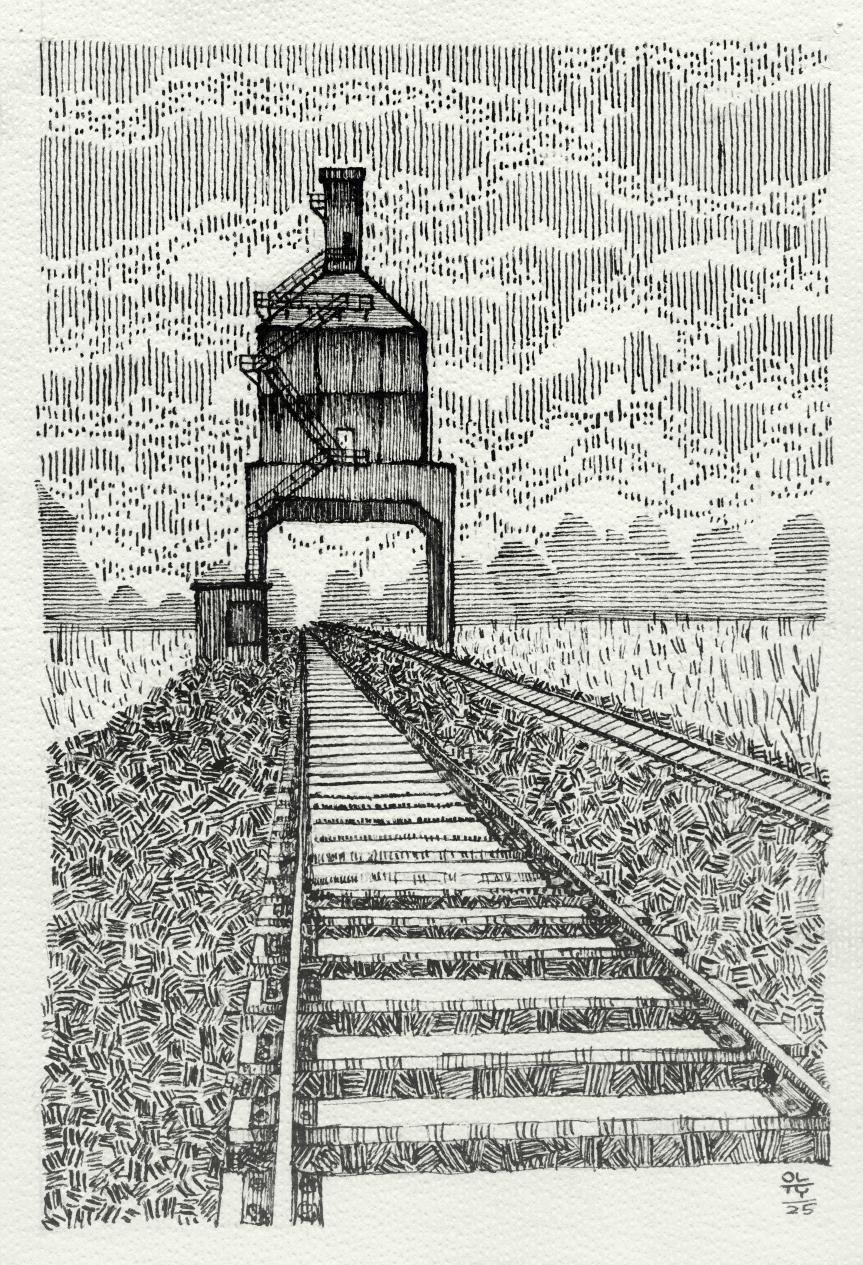 Графическая работа «Угольная башня» — это метафорическое изображение промышленного памятника, символизирующего столкновение естественного и искусственного, прошлого и настоящего. Старинная угольная башня, окруженная рельсами и травой, становится центром композиции, напоминая о времени, когда индустриализация меняла ландшафт и жизнь людей. Работа исследует тему преодоления хаоса через порядок, и неизбежного поражения порядка в этой борьбе. То что когда-то было остриём прогресса теперь просто деталь пейзажа.