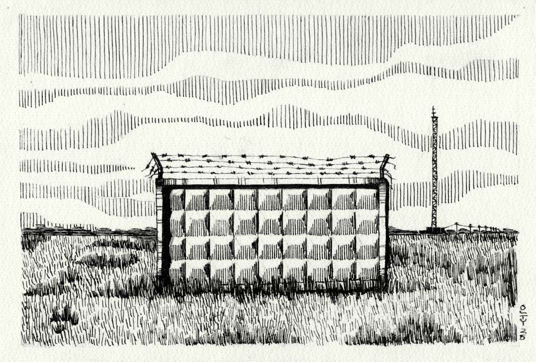В этой графической работе изображена секция бетонного забора, стоящая в пустынном поле. Вдали видна телебашня. Оба объекта выглядят одинокими и отстраненными, словно оставленными временем. Секция забора, когда-то огораживающая территорию теперь стоит одиноко в чистом поле не мешая проходу и территории, которую огораживал забор больше нет, она слилась с окружающим ландшафтом, стала его частью. Телебашня вдалеке также напоминает о былой эпохе, когда она была центром информационного пространства. Теперь же, с появлением интернета и разрушением границ информации она так же утратила свою функцию и стоит одиноко как и секция забора став символом прошлого, которое постепенно растворяется в современности.