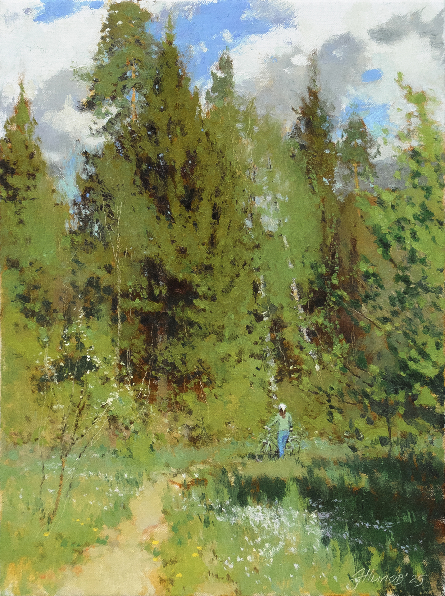 Середина мая. Залитая солнцем опушка леса, по дороге в деревню Майна. Помню, как писал это место в декабре, тогда меня на полпути в работе застиг снегопад. А теперь, эта залитая теплым солнцем опушка, приветливо встречает местных жителей и едущих за водой к роднику. Невероятно живописные места, дарящие все новые и новые мотивы в работе! Уже после просушки вписал стаффаж.