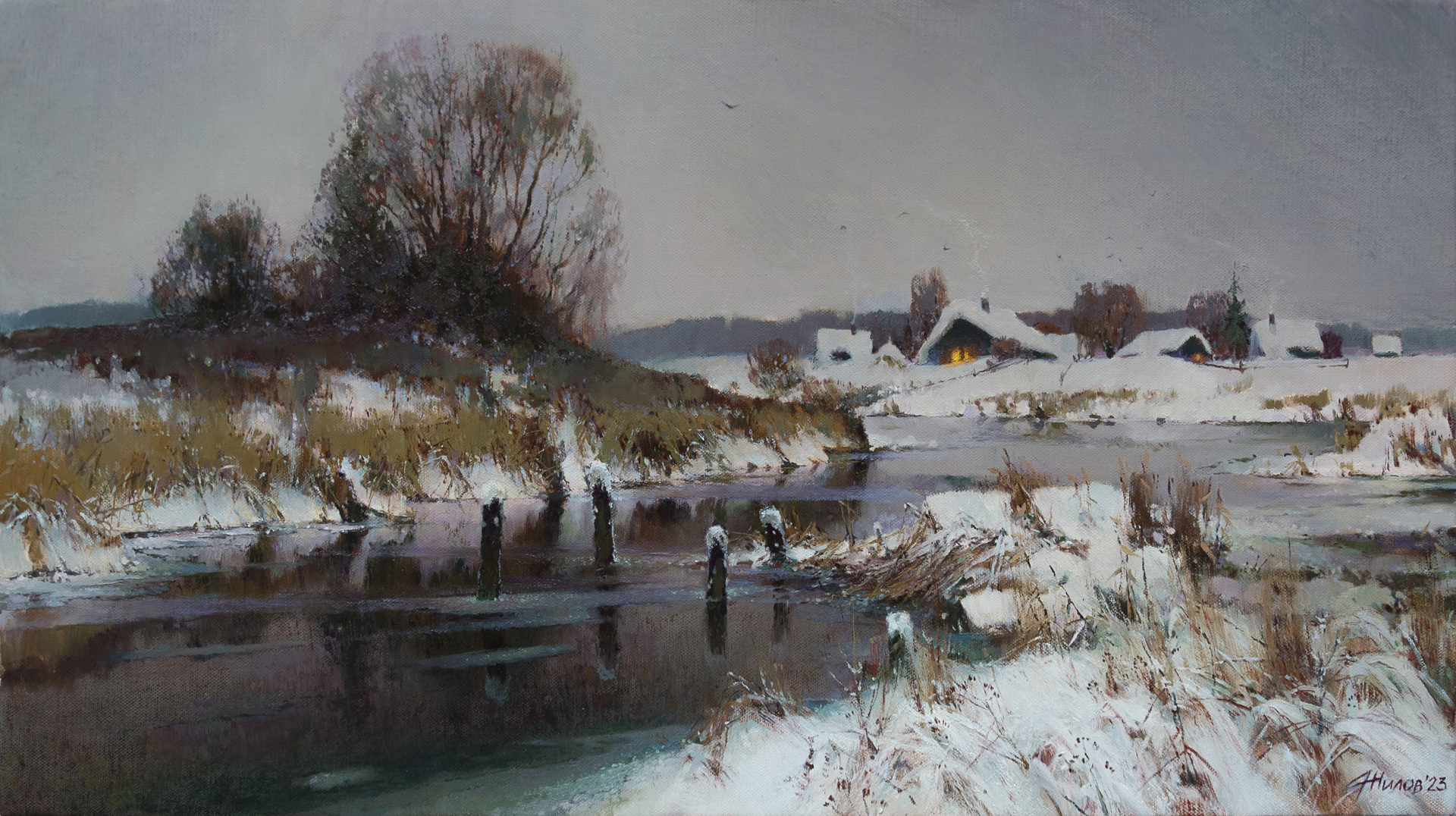 Когда я писал этюд к этой картине, а это была суббота, стояла тихая пасмурная погода, занимались ранние сумерки. Уже насыпало снега, но вода еще таила тепло, и робкий ледок был виден пока лишь у берега. И уже начав работать, начала заниматься метель, засыпая палитру мелкими снежными иголками. Я уже подумывал собираться домой, как погода снова поутихла. Но тогда то был этюд. Я ехал домой с мыслью, как же здорово будет согреться дома, тем более суббота- банный день! Потому и домики, которые появились на том берегу в этой станковой картине, свет их окон, явили собой те самые мысли о тепле домашнего очага.