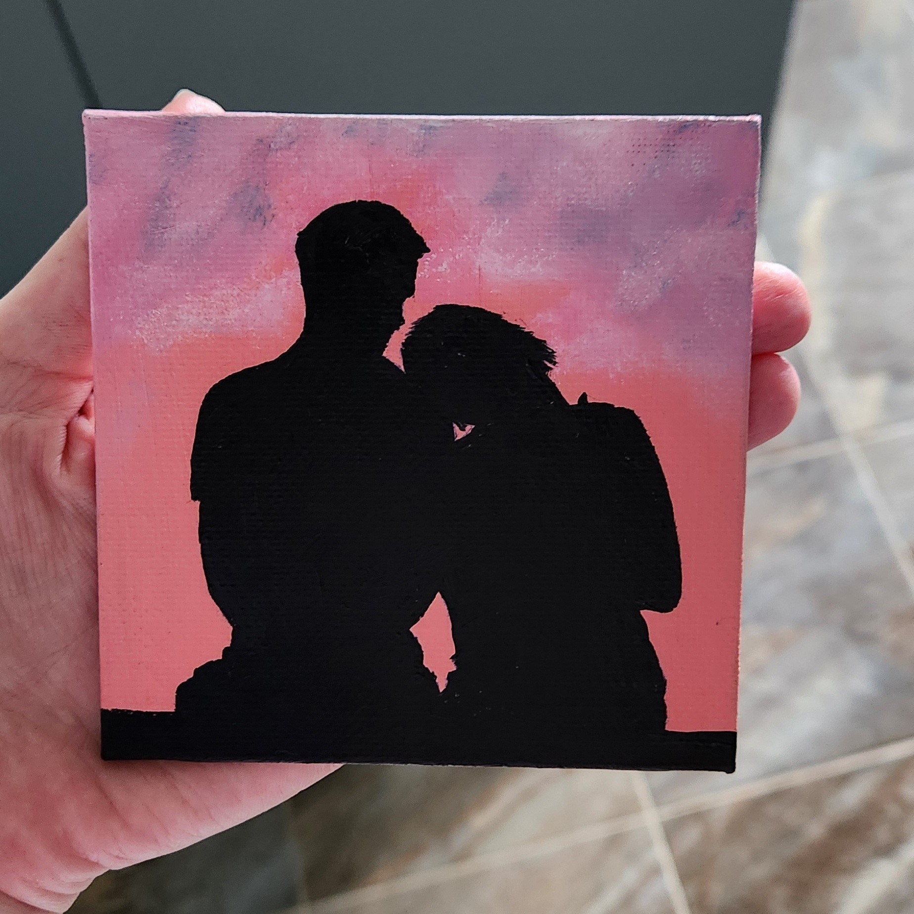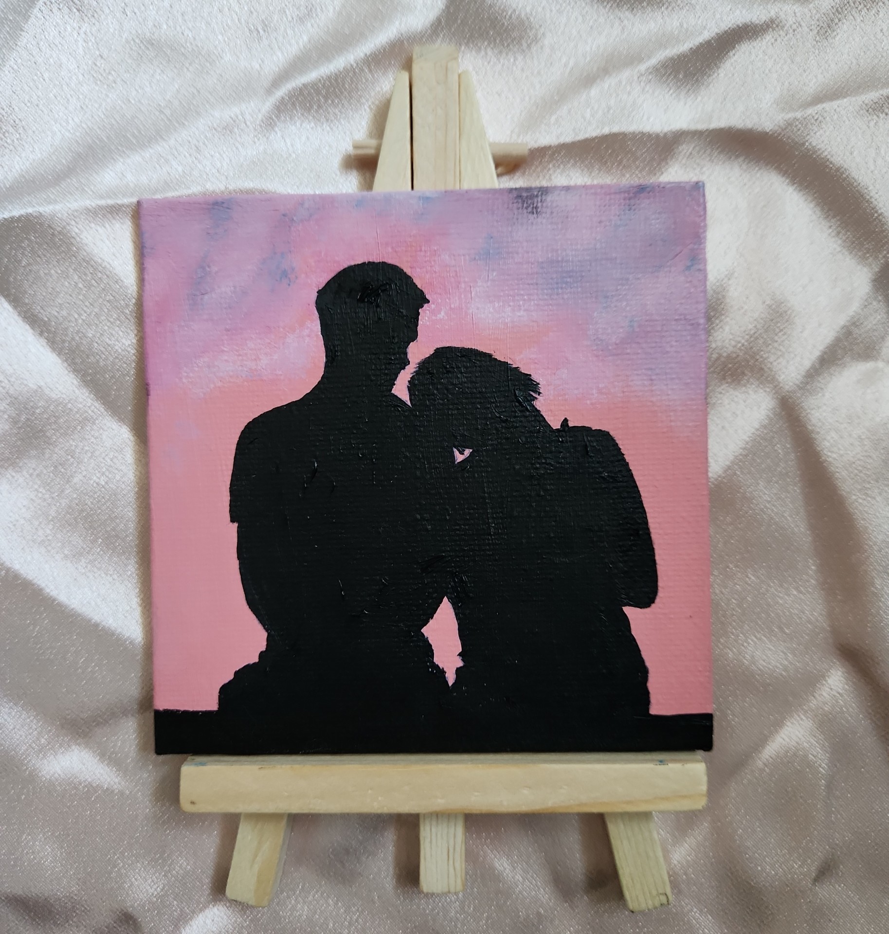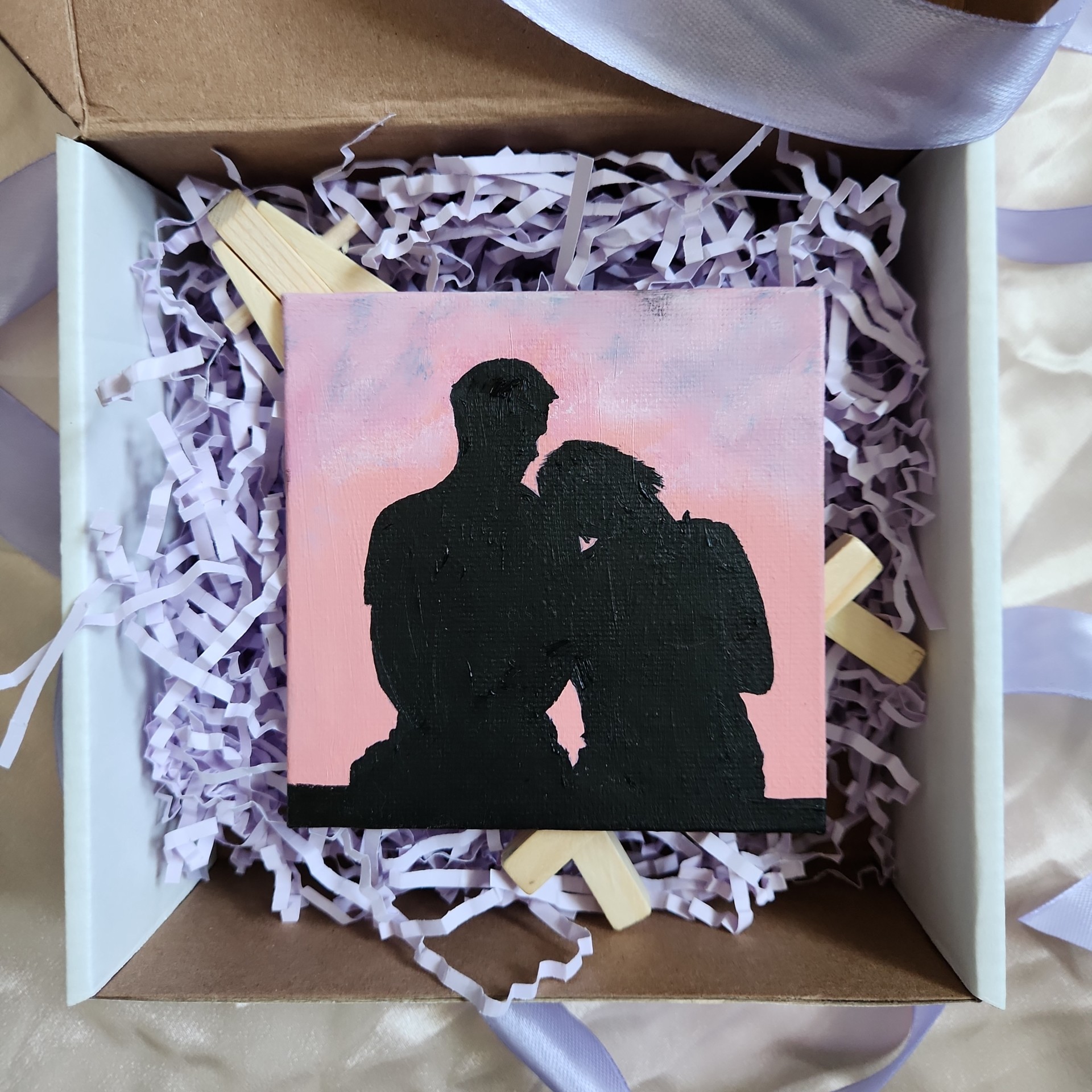 Мини-картина 10×10 см | Масло, холст на картоне | Мольберт + подарочная упаковка Маленький квадрат, а внутри — целый мир. Силуэты мужчины и женщины на нежно-розовом фоне словно остановили время. Это история о близости, где не нужны слова. Только взгляд. Только «мы». Идеальный арт-намёк на любовь. Тёплый, искренний, тихий. ❤️ Кому подойдёт: — В подарок второй половинке — Тем, кто хочет маленькое «о любви» в доме — Как милый арт-аксессуар на полку, стол, трельяж — Или… как напоминание: «ты не одна»