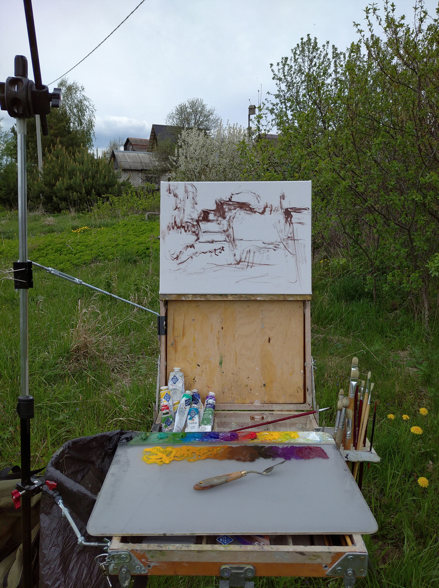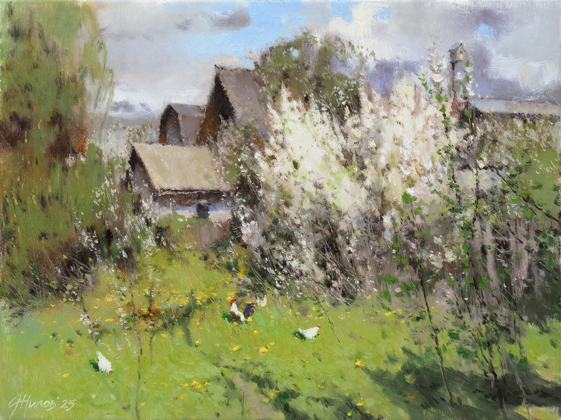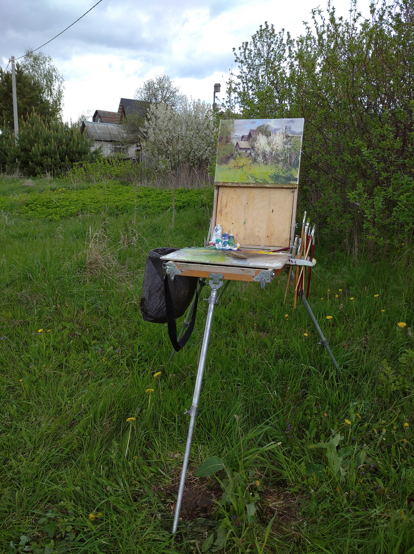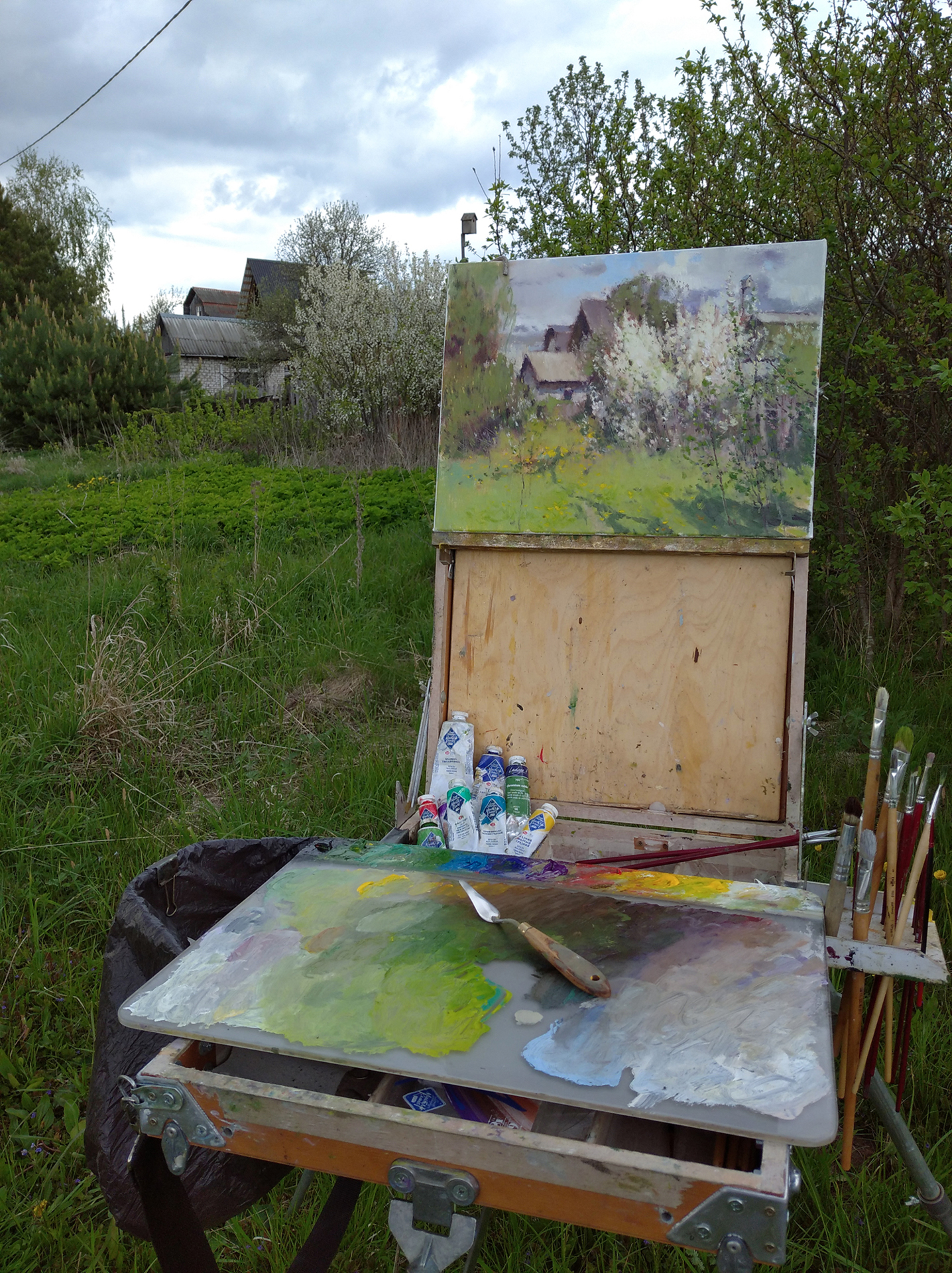День начинался погожим. Но постепенно небо затянула пасмурная пелена и я, уже начав работу, решил писать картину по памяти, опираясь на натуру уже больше в качестве рисунка. Это мой такой первый опыт, что практически с самого начала работы моделировать свет приходится самому, а не заимствуя его у натуры. Это местечко на окраине поселка Березовка я облюбовал уже давно: в мае пышно цветут сады, и живописных мотивов во множестве! Уже позже, после просушки, вписал стаффажи.