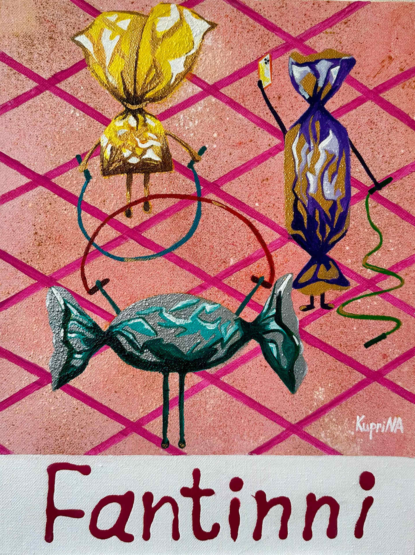 Работа из серии "Сладкий фитнес". Выполнена в авторской технике на хосте на подрамнике. Холст текстурный, посыпанный художественный пудрой, а имя персонажа подписано растекающейся краской, напоминающей сладкую глазурь. Яркая, юмористическая, аппетитная, уникальная иллюстрация о том, что во всем нужен баланс, и что на первый взгляд даже самые несочетаемые вещи могут отлично совмещаться друг с другом. Работа принесет юмор и позитив в любой интерьер, особенно кондитерских, пекарен, кафе и ресторанов, а также вашей кухни или любимого места в доме. Это отличный подарок для сладкоежек и любителей заниматься спортом. У каждого персонажа в серии есть имя, а вид спорта подобран под его особенности.