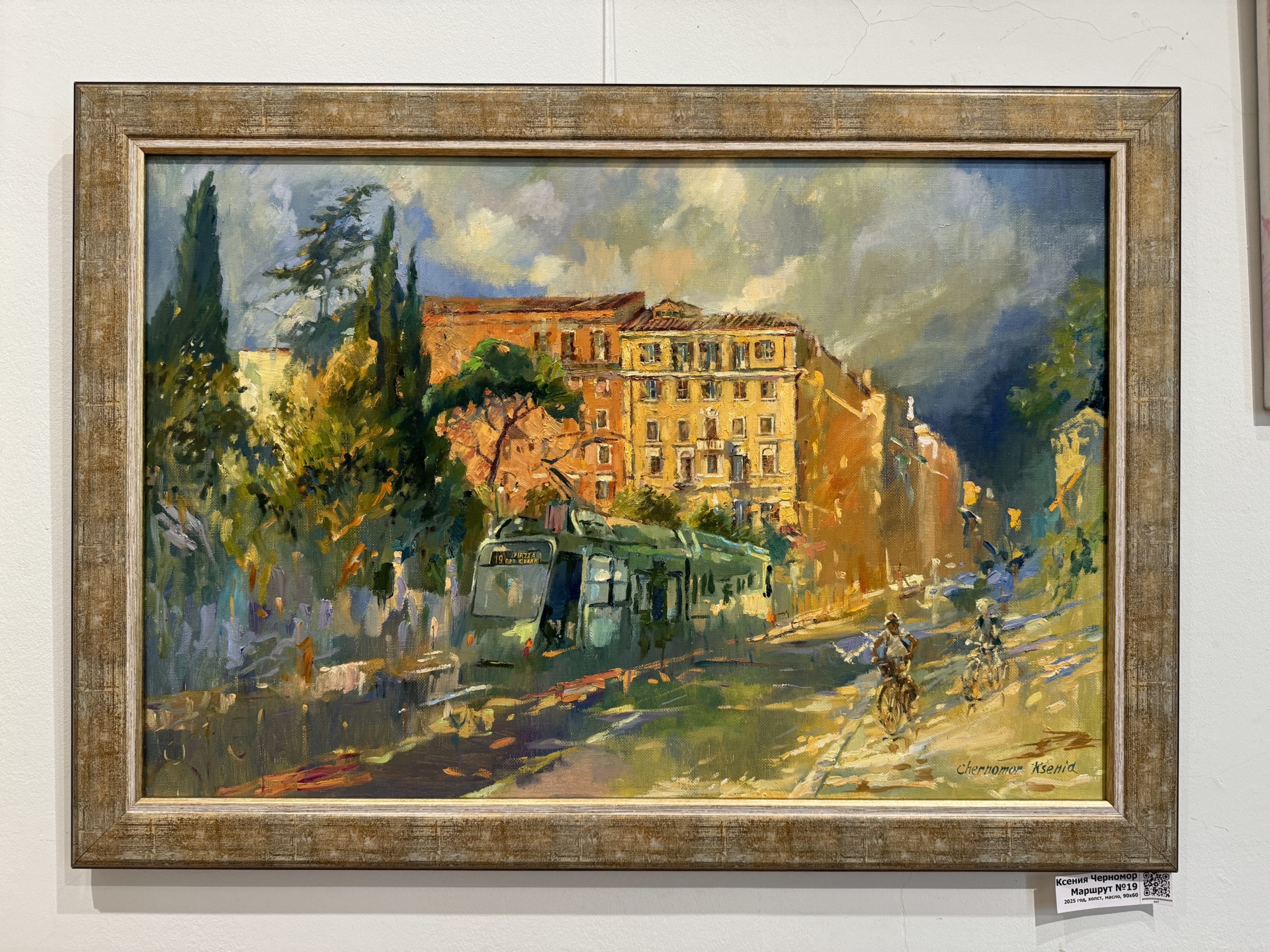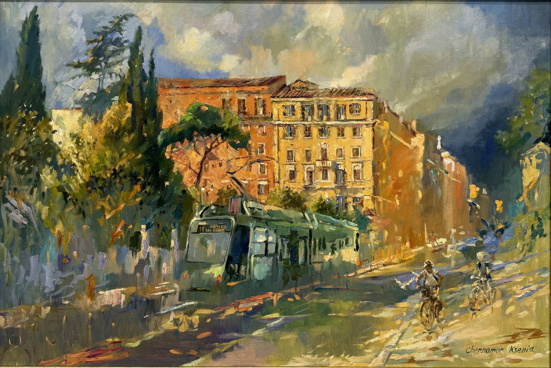Ксения Черномор «Маршрут №19», холст, масло, 90*60. Есть в Риме трамвай - настоящий помощник туриста! Это маршрут №19. Римляне говорят про него "железная артерия, пересекающая сердце Рима". И правда, путешествуя этим маршрутом, можешь увидеть весь Рим – и священный, и повседневный. Вот идея одного дня в Риме для самостоятельных путешественников! Начните свое путешествие от площади Risorgimento (неподалеку от Ватиканских музеев), а дальше выбирайте сами, где сойти. Самые интересные точки маршрута: ?Кварталы Прати и Фламинио ?Дворец Марина (дворец Министерства Обороны) ?Музей Этрусков на вилле Джулия ?Национальная Галерея Современного Искусства ?Вилла Боргезе ?Биопарк ?Квартал Париоли (один из самых респектабельных и дорогих в Риме) ?Квартал Коппеде (один из самых удивительно-необычных в Риме) ?университет Сапьенца – первый университет Рима ?кладбище Верано – это очень красивое кладбище, и там есть даже русская часть, где похоронены русские аристократы, философы и писатели.