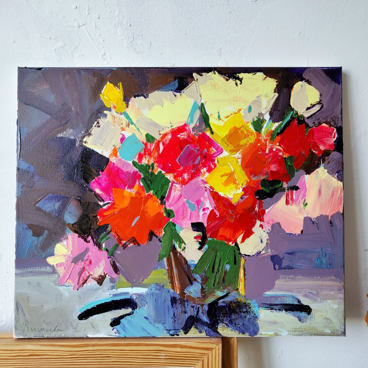 Эта работа написана с натуры во время пленэра в Коктебеле в Июне. Мне понравились яркие разнообразные по цвету розы и как они контрастировали с каменной стеной в тени. Камни стены усиливали цвет и свечение, а цветы как бы "горели" в воздухе. Работа создавалась в один сеанс, на вдохновении, спонтанности и живо.