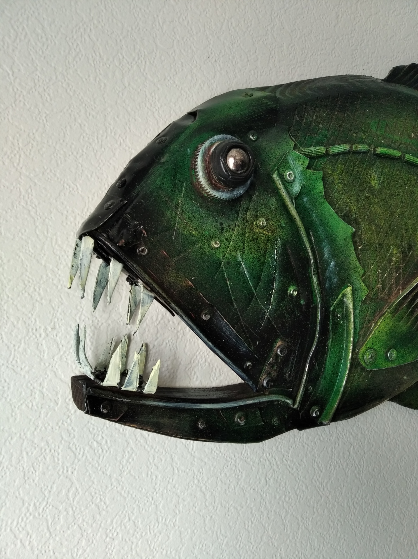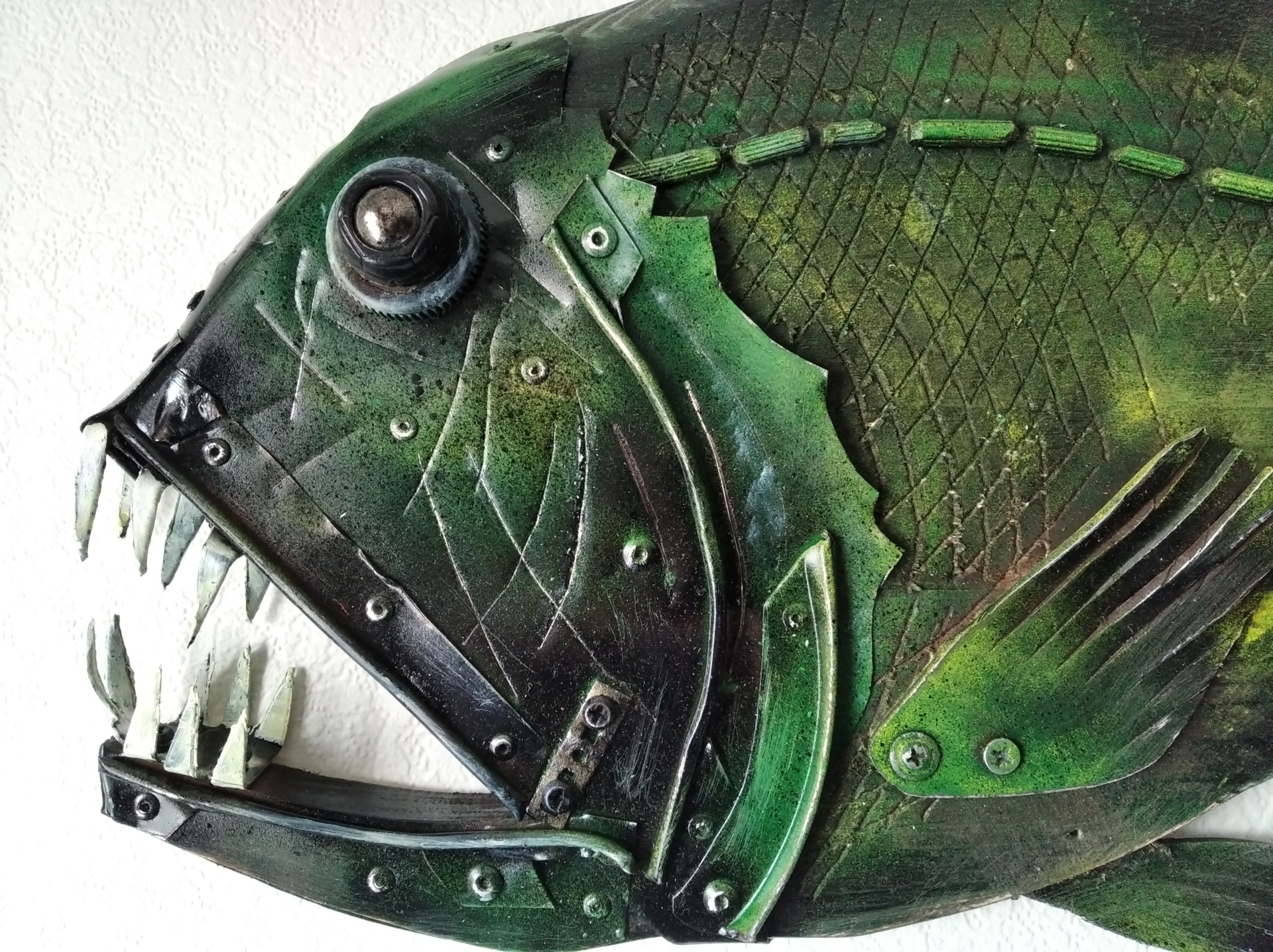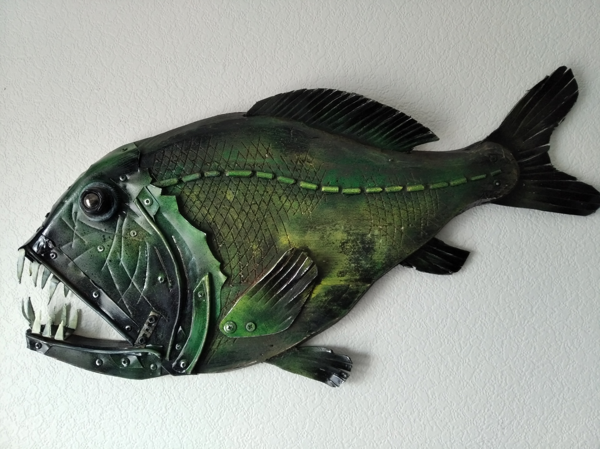 Рыба № 25 часть 2 Автор: Hakaro. Материал: дерево, металл, пластик. Имеет крепление на стену. Hakaro — современный российский художник. Недавно он заинтересовался новой тенденцией в современном искусстве под названием апсайклинг (от англ. «upcycling» т.е. вторичное использование материалов и вещей и приданием им новой функциональности.которое включает в себя превращение старых, устаревших товаров в новые предметы искусства. Апсайклинг как способ создания произведений искусства — это в первую очередь альтернатива традиционным формам искусства. Современное общество пристрастилось к потребительству, не подозревая о том, что ресурсы планеты конечны. Концепция Hakaro заключается в том, что из предметов, которые по разным причинам не перерабатываются, можно создавать произведения искусства, давая им вторую жизнь и превращая их в функциональное изделие, предмет декора в современном интерьере.