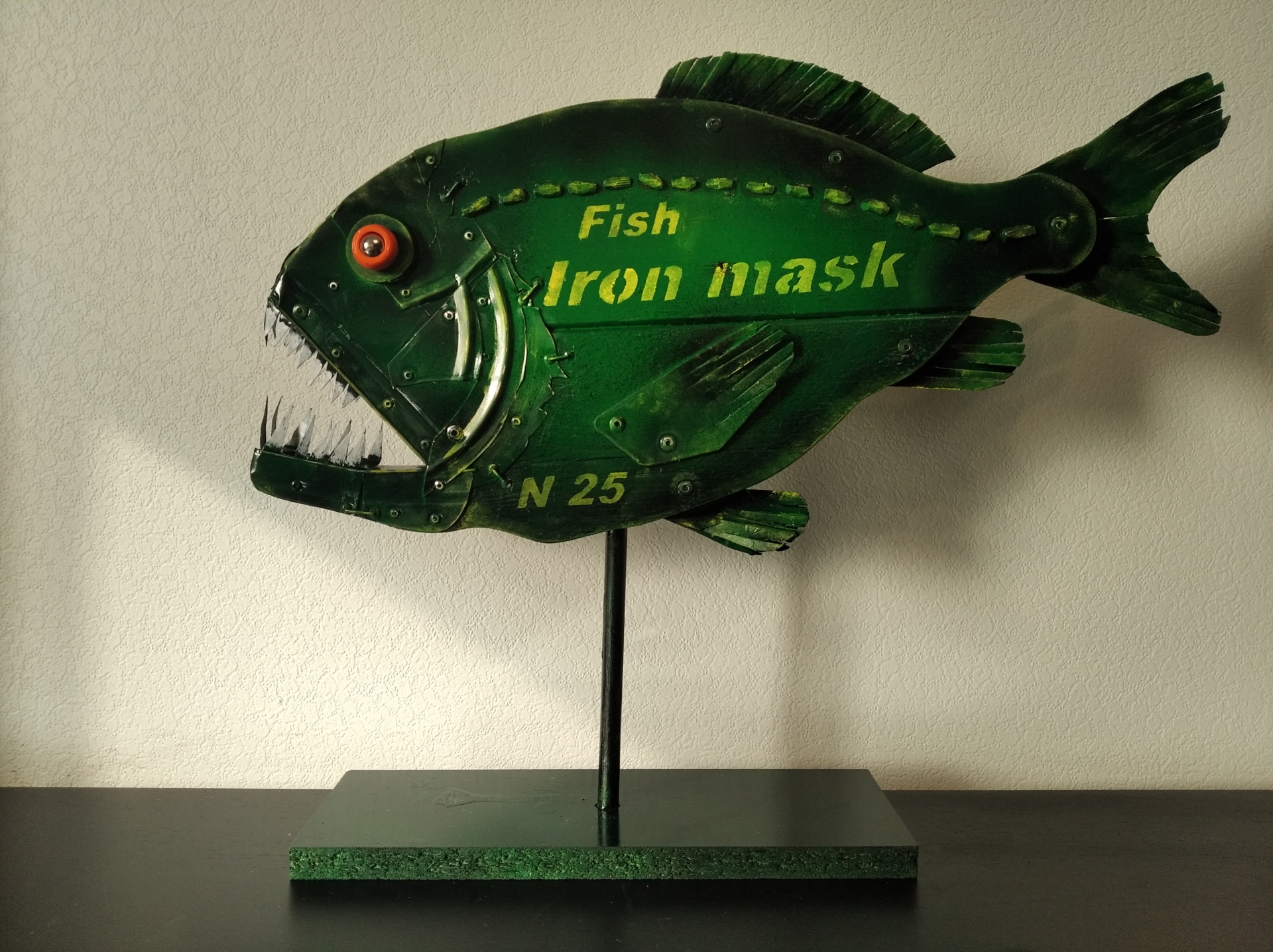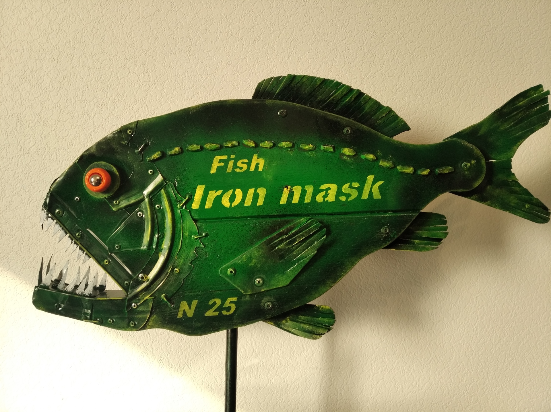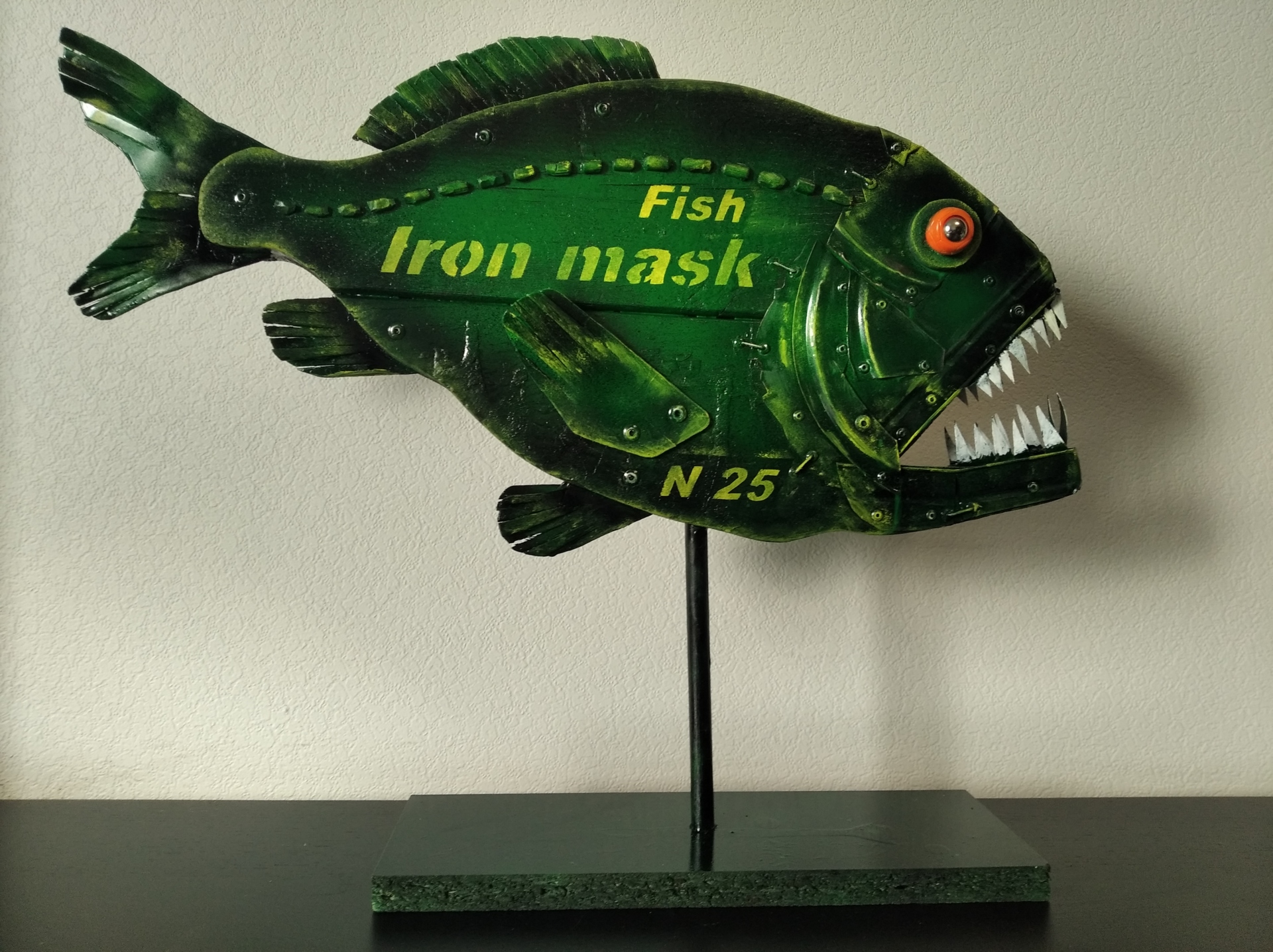 Рыба № 25 часть 3 Железная маска Автор:Hakaro Материал: дерево, металл, пластик Hakaro — современный российский художник. Недавно он заинтересовался новой тенденцией в современном искусстве под названием апсайклинг (от англ. «upcycling» т.е. вторичное использование материалов и вещей и приданием им новой функциональности.которое включает в себя превращение старых, устаревших товаров в новые предметы искусства. Апсайклинг как способ создания произведений искусства — это в первую очередь альтернатива традиционным формам искусства. Современное общество пристрастилось к потребительству, не подозревая о том, что ресурсы планеты конечны. Концепция Hakaro заключается в том, что из предметов, которые по разным причинам не перерабатываются, можно создавать произведения искусства, давая им вторую жизнь и превращая их в функциональное изделие, предмет декора в современном интерьере.