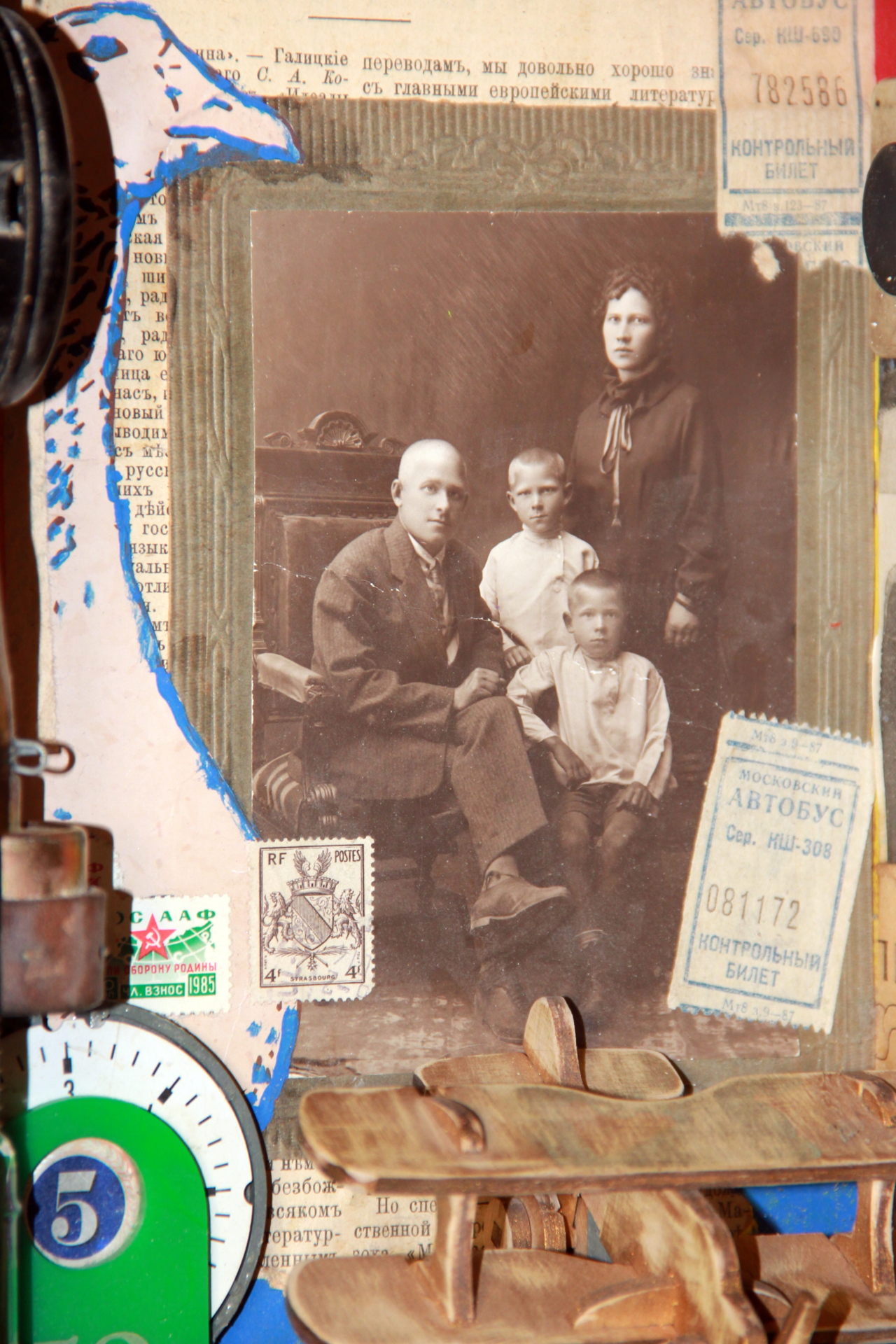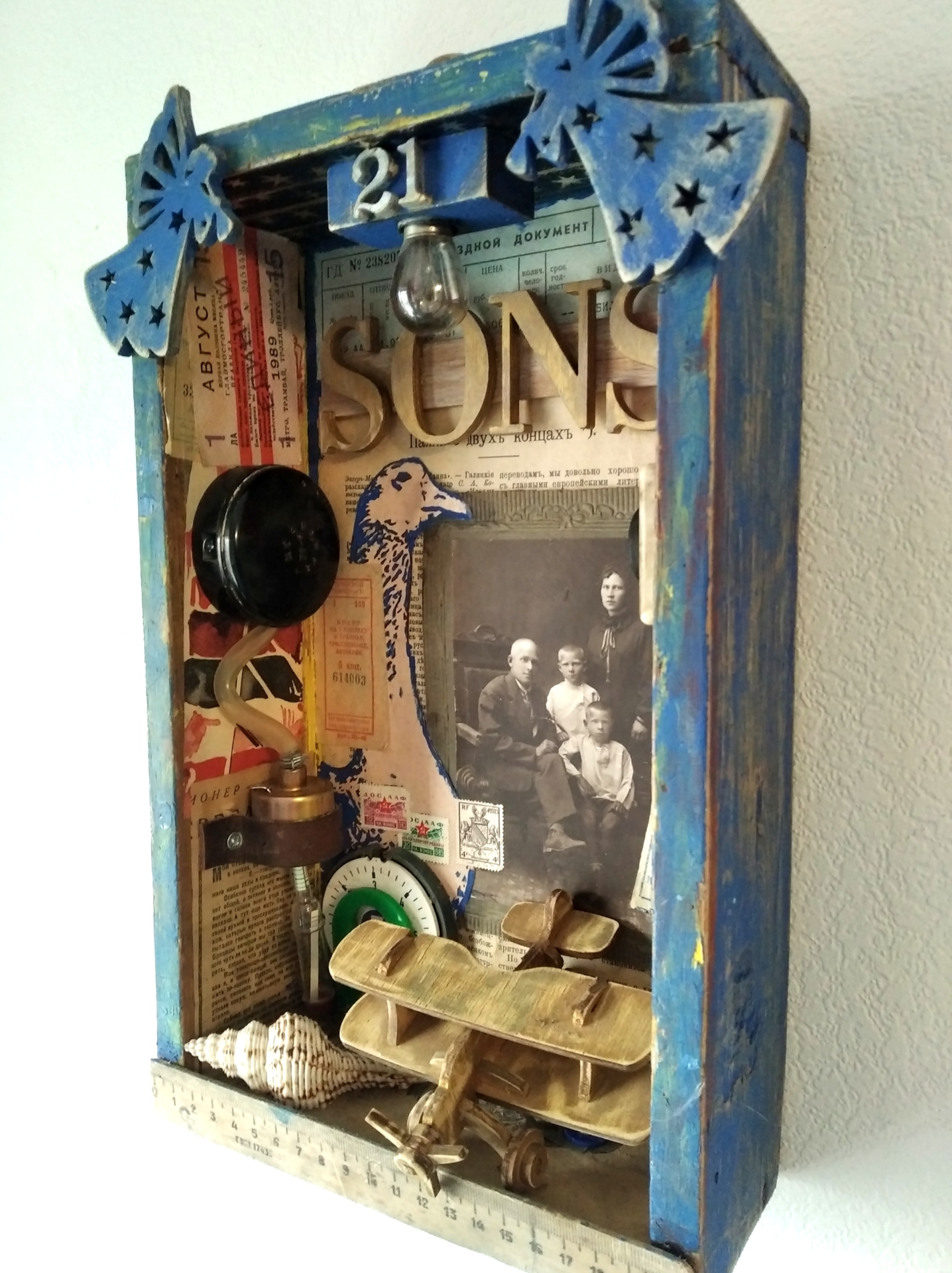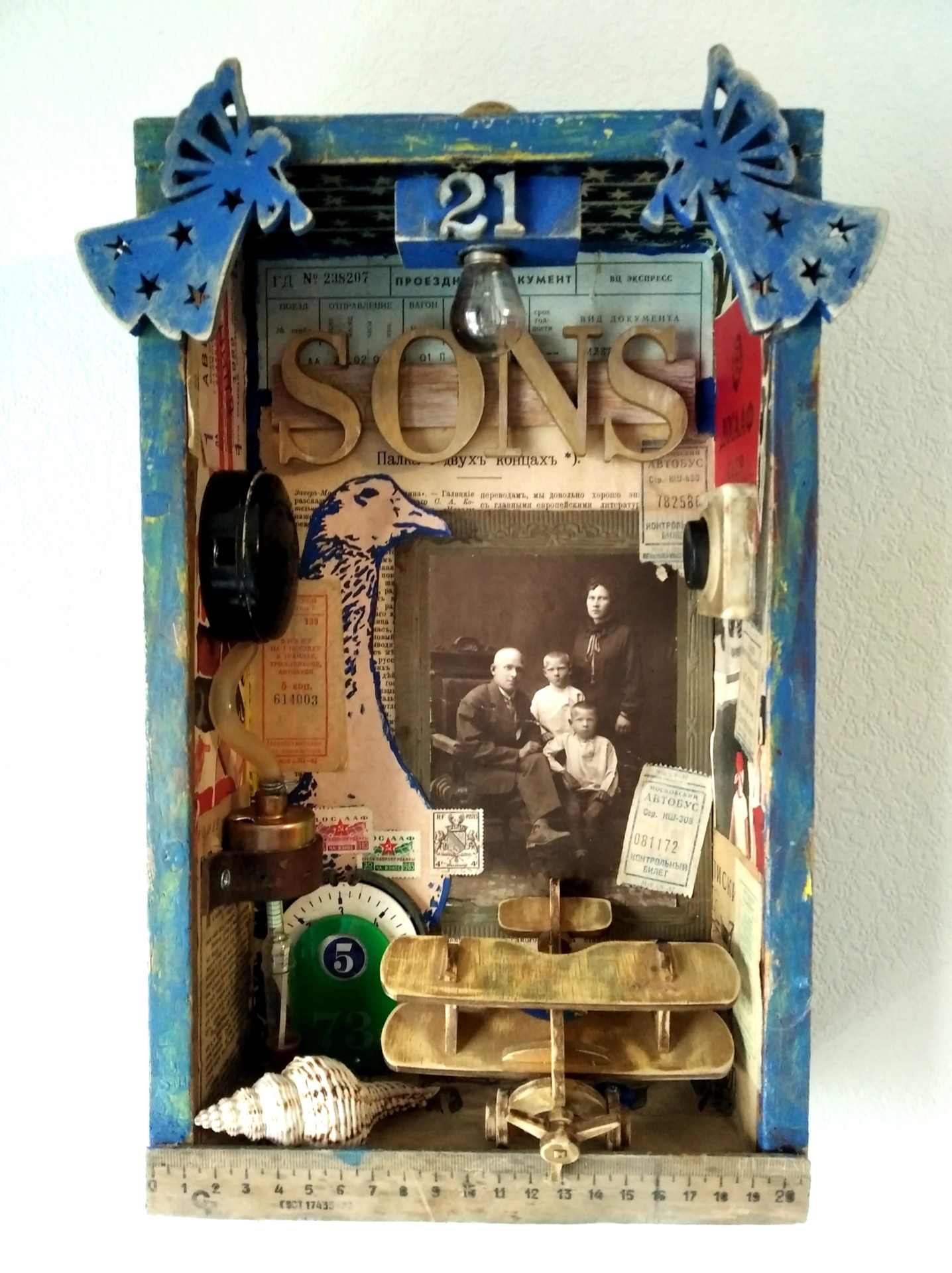 Ассамбляж Сыновья.Автор:Hakaro 2021г. I continue the topic of discarded photos…I live in a fairly old house built in the 60s of the last century…If earlier people living in the same house knew each other, now everyone has become almost strangers to each other…Apartments began to be sold, given up, people began to change their places of residence more often…People die, are born, get married, get married, children, wives, husbands, mothers-in-law, mothers-in-law, grandparents...everything flows and everything changes in life…Last week, someone apparently died in the next doorway...and as usual, relatives or new owners of the apartment appear and begin repairs. Previously of course they clean the old apartment from already unnecessary things…There are no previous owners, and the new "junk" is not needed. So this time, the workers doing the repairs took out everything unnecessary and dumped it in a pile near the entrance. A container with garbage will arrive, and then everyone will be thrown into it. I saw an old desk drawer in the pile and asked for it from a nearby worker. He handed it to me without a word. In the drawer were some small things and an old photograph. The photo is most likely from the 20-30s of the 20th century…It's got a family on it. A husband, a wife, and two boys very similar to each other. On the back is the signature " Romanenko»… ... I could not throw out everything that was in the box...and I made an assemblage of what was in the box, adding something from myself…He called it "Sons". What happened you see...it's a pity, of course, that someone so easily parted with the memory. I took it and threw it away and my heart didn't skip a beat…We come into this world with nothing and leave with nothing. After us, only the memory remains, and then, probably, not for long...Life is still as beautiful and merciless…