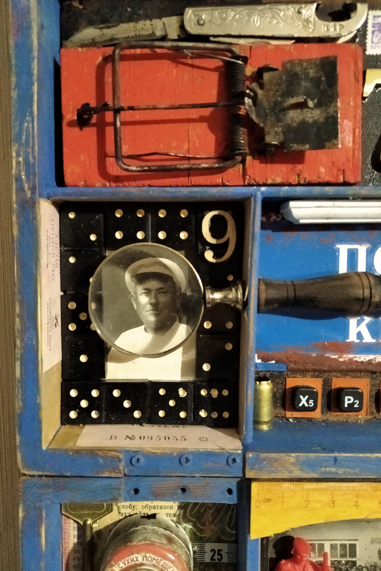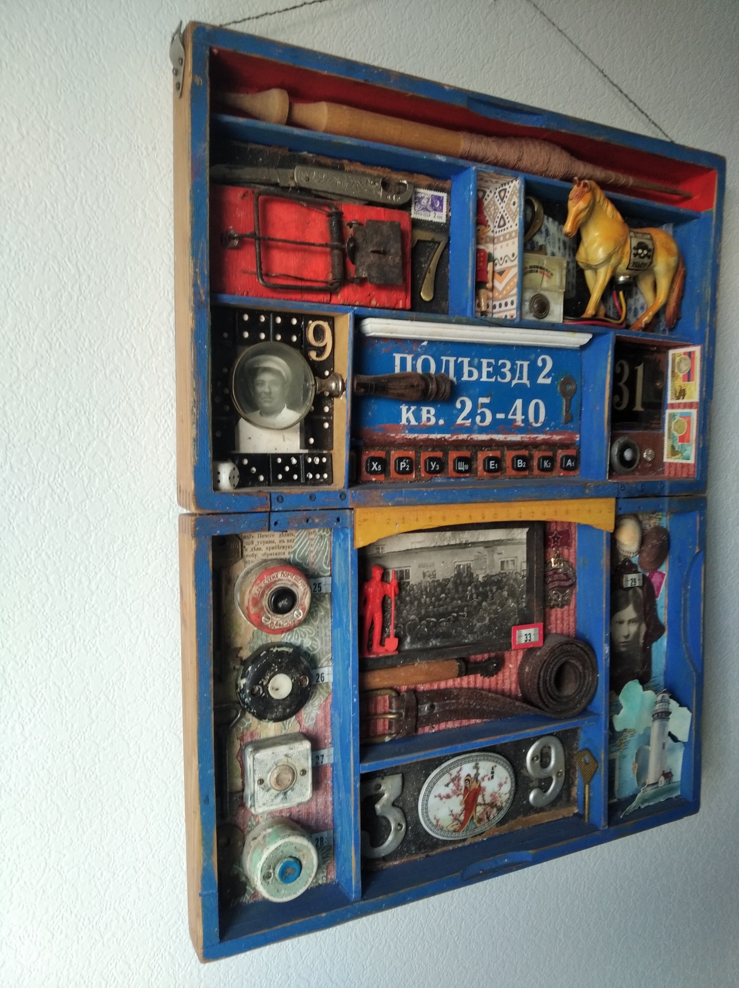Ассамбляж " Хрущевка" Автор: Hakaro 2022г. The "Khrushchevka" assemblage is a unique author's work using three-dimensional details and whole objects. The size is 40x52x4. It is devoted to the topic of Soviet standard panel or brick residential buildings, named after N. S. Khrushchev, during whose reign their mass construction in the USSR began.