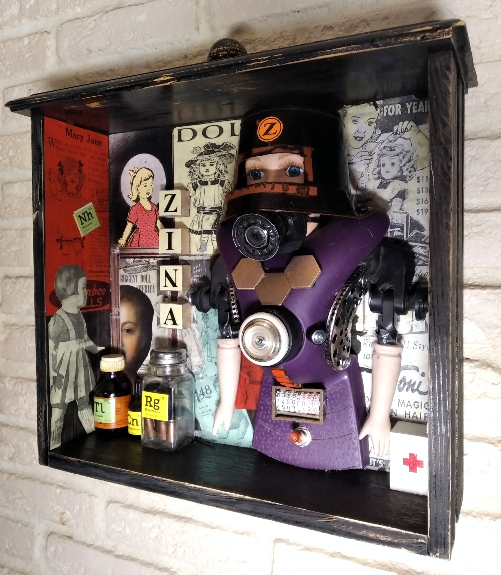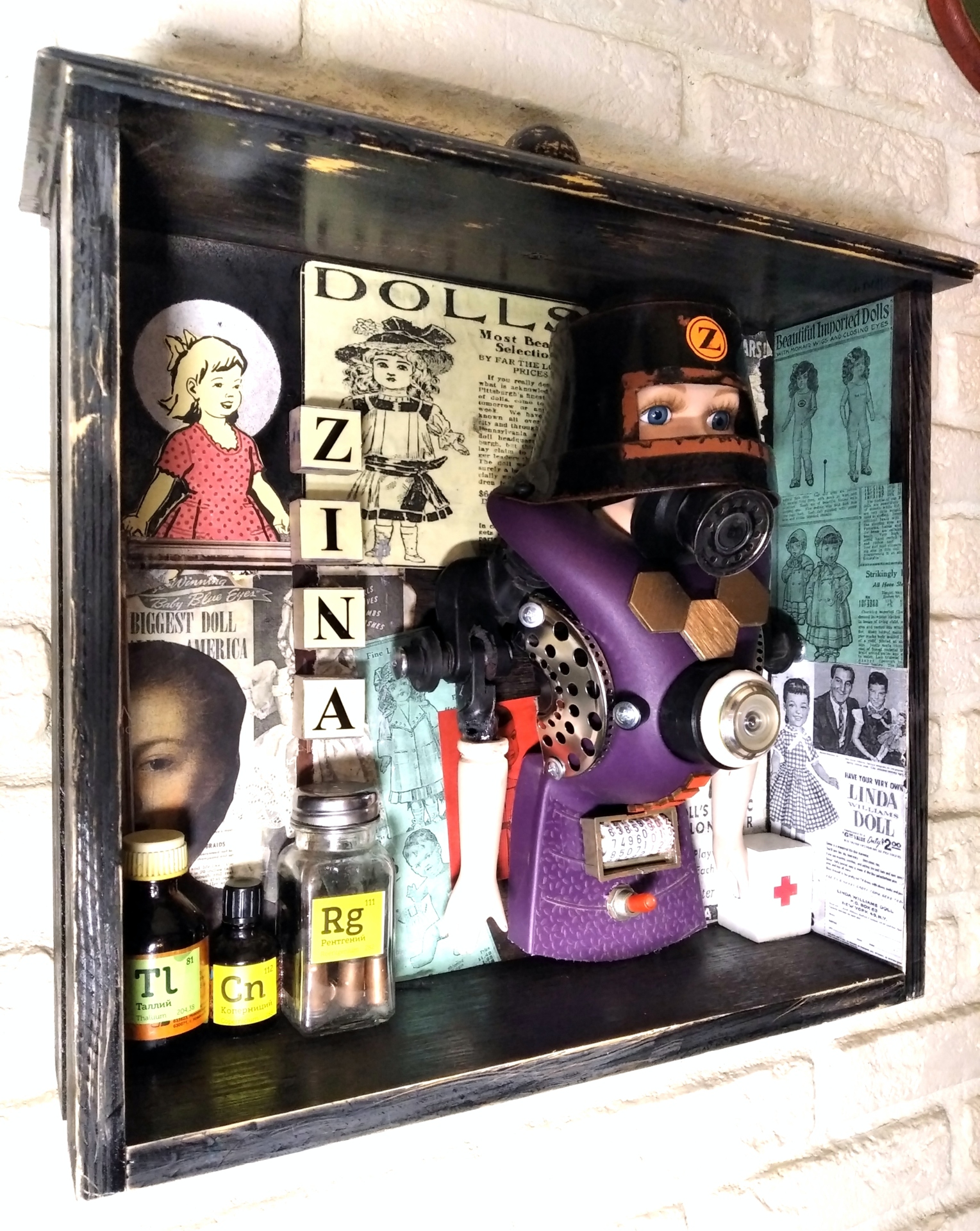 Ассамбляж Кукла Зина Автор: Hakaro 2022 г. Doll Zina. I don't want kids no to play with this doll ... but they're already playing... Hakaro — современный российский художник. Недавно он заинтересовался новой тенденцией в современном искусстве под названием апсайклинг (от англ. «upcycling» т.е. вторичное использование материалов и вещей и приданием им новой функциональности.которое включает в себя превращение старых, устаревших товаров в новые предметы искусства. Апсайклинг как способ создания произведений искусства — это в первую очередь альтернатива традиционным формам искусства. Современное общество пристрастилось к потребительству, не подозревая о том, что ресурсы планеты конечны. Концепция Hakaro заключается в том, что из предметов, которые по разным причинам не перерабатываются, можно создавать произведения искусства, давая им вторую жизнь и превращая их в функциональное изделие, предмет декора в современном интерьере.
