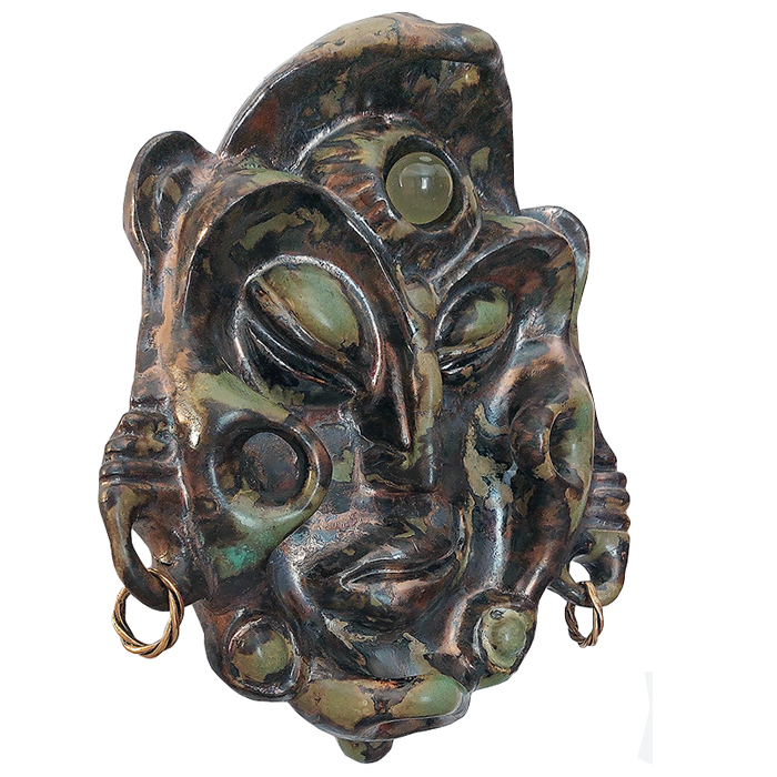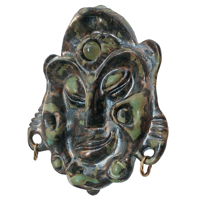 Интерьерная маска Будда. Материалы: глина, обжиг с глазурью, вставки: полудрагоценный камень - цитрин (дымчатый кварц), в ушах бронзовые серьги