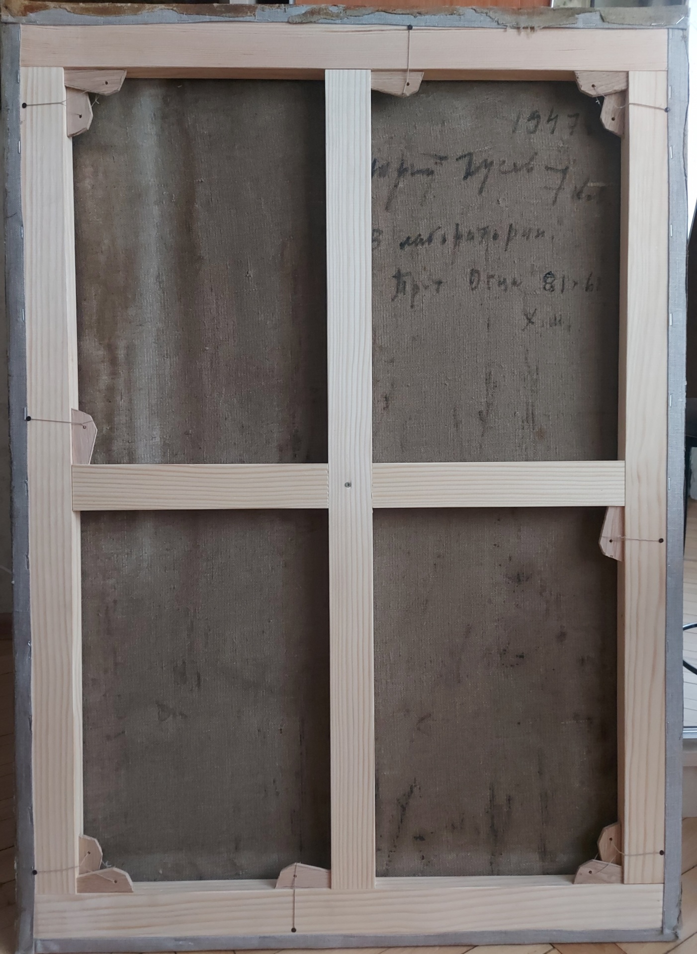Работа после профессиональной реставрации, красочный слой укреплен. Холст натянут на новый подрамник с клинышками.