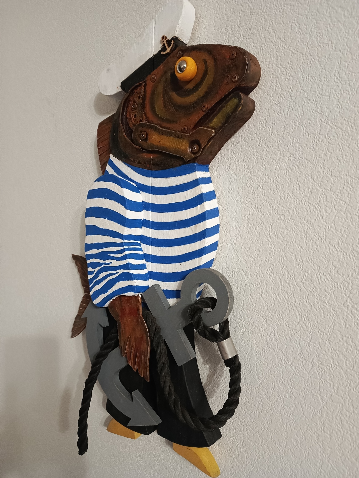 Моряк Альберт. Возвращение. 2025 Автор: Hakaro Hakaro — современный российский художник. Недавно он заинтересовался новой тенденцией в современном искусстве под названием апсайклинг (от англ. «upcycling» т.е. вторичное использование материалов и вещей и приданием им новой функциональности.которое включает в себя превращение старых, устаревших товаров в новые предметы искусства. Апсайклинг как способ создания произведений искусства — это в первую очередь альтернатива традиционным формам искусства. Современное общество пристрастилось к потребительству, не подозревая о том, что ресурсы планеты конечны. Концепция Hakaro заключается в том, что из предметов, которые по разным причинам не перерабатываются, можно создавать произведения искусства, давая им вторую жизнь и превращая их в функциональное изделие, предмет декора в современном интерьере.