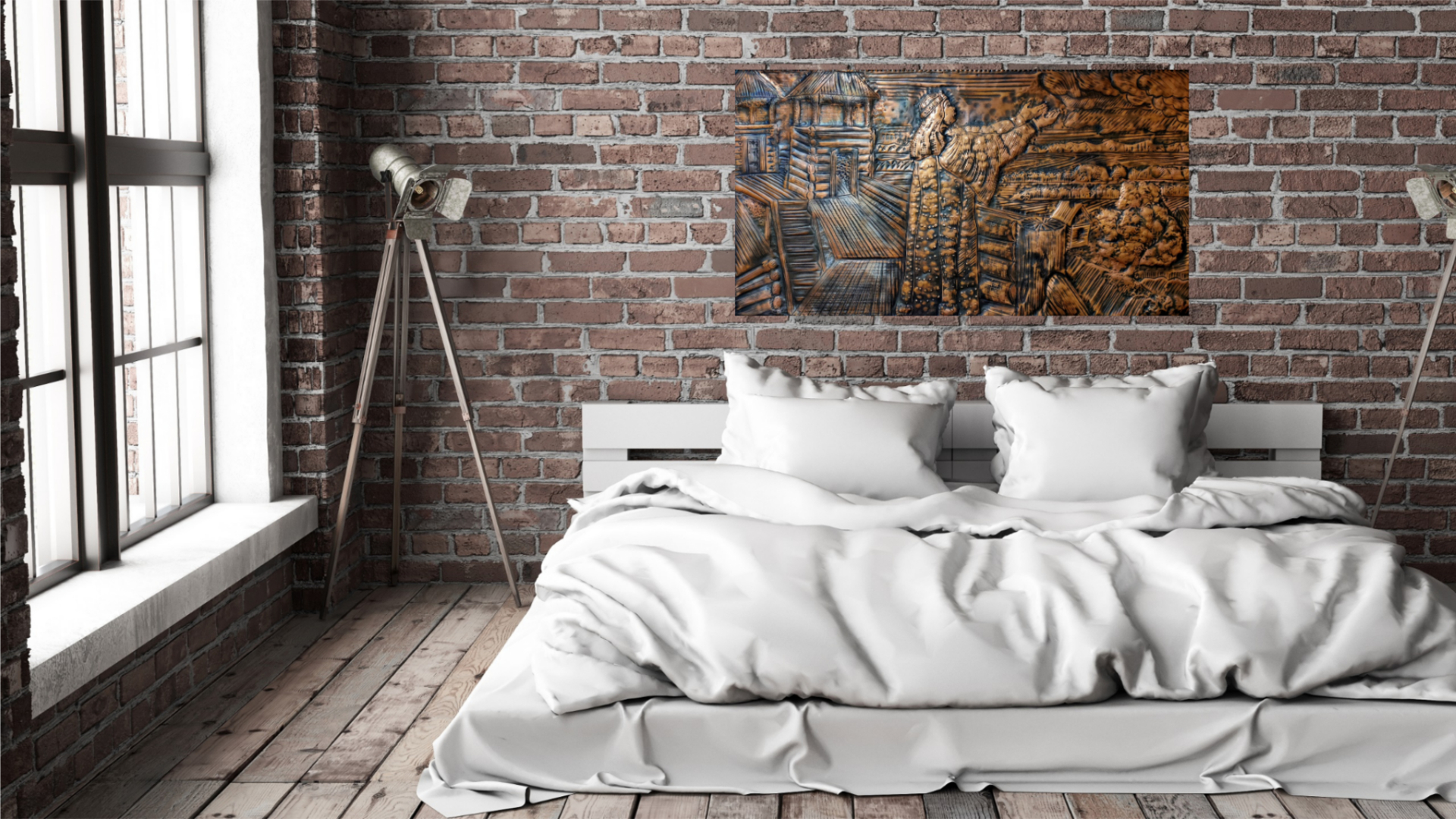 Панно чеканка выполнено по иллюстрации Фаворского В.А. "Слово о полку Игореве" из листа меди методом чеканки и металлопластики . Оформлено в багет. То не кукушка в роще темной Кукует рано на заре — В Путивле плачет Ярославна, Одна, на городской стене: «Я покину бор сосновый, Вдоль Дуная полечу, И в Каяль-реке бобровый Я рукав мой обмочу; Я домчусь к родному стану, Где кипел кровавый бой, Князю я обмою рану На груди его младой». В Путивле плачет Ярославна, Зарей, на городской стене: «Ветер, ветер, о могучий, Буйный ветер! что шумишь? Что ты в небе черны тучи И вздымаешь и клубишь? Что ты легкими крылами Возмутил поток реки, Вея ханскими стрелами На родимые полки?» В Путивле плачет Ярославна, Зарей, на городской стене: «В облаках ли тесно веять С гор крутых чужой земли, Если хочешь ты лелеять В синем море корабли? Что же страхом ты усеял Нашу долю? для чего По ковыль-траве развеял Радость сердца моего?» В Путивле плачет Ярославна, Зарей, на городской стене: «Днепр мой славный! ты волнами Скалы половцев пробил; Святослав с богатырями По тебе свой бег стремил, — Не волнуй же, Днепр широкий, Быстрый ток студеных вод, Ими князь мой черноокий В Русь святую поплывет». В Путивле плачет Ярославна, Зарей, на городской стене: «О река! отдай мне друга — На волнах его лелей, Чтобы грустная подруга Обняла его скорей; Чтоб я боле не видала Вещих ужасов во сне, Чтоб я слез к нему не слала Синим морем на заре». В Путивле плачет Ярославна, Зарей, на городской стене: «Солнце, солнце, ты сияешь Всем прекрасно и светло! В знойном поле что сжигаешь Войско друга моего? Жажда луки с тетивами Иссушила в их руках, И печаль колчан с стрелами Заложила на плечах». И тихо в терем Ярославна Уходит с городской стены.