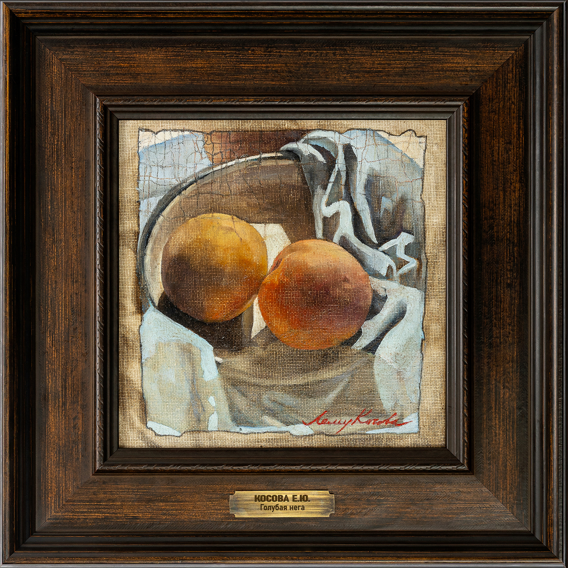 «Голубая нега» — картина для ценителей утонченной эстетики. Это натюрморт, согретый жарким дыханием юга. Персики на холсте излучают внутренний свет, их бархатистая кожица, переливаясь на солнце, окутана голубой негой тончайшей драпировки. Кажется, что картина переносит нас в беззаботный полдень на залитой солнцем веранде итальянской виллы. Работа построена на игре световых эффектов: сочные краски соседствуют с участками, где просвечивает фактура холста. Как и все работы серии «Ускользающая красота», созданной в Италии, она философски осмысливает совершенство мимолетного момента, предлагая зрителю остановиться и прочувствовать его глубину. Изысканность работы подчеркивает ее оформление: камерный холст в широком деревянном багете, бархатный задник и латунная табличка. Мягкая дымка сфумато и тонкая сетка кракелюров, нанесенная вручную, связывают ее с искусством прошлого, утверждая вневременную ценность запечатленного мгновения. Эта картина создана для ценителей, чья коллекция говорит об исключительном вкусе. Идеальный выбор для статусного подарка подчеркивает ее выставочный успех в 2025 году: картина приняла участие в международной мультимедийной выставке «Dialogue across Continents», в общероссийской выставке-конкурсе «Талант России» (Москва), а также в международной выставке-конкурсе «Искусство натюрморта» (Москва). Совместно с другими работами серии «Ускользающая красота» картина экспонировалась на персональной выставке художницы в Падуе (Италия). Цена указана с рамкой.