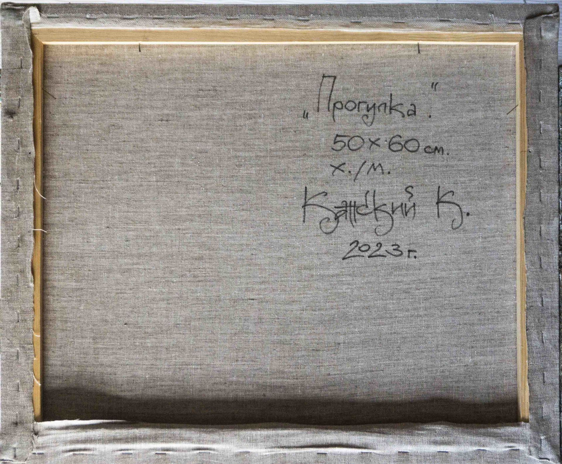 Светлая по настроению и ощющению работа. Маленький друг мотивирует хозяйку к прогулке. Романтичная, барышня гуляет с небольшим, изящным, хвостатым другом. По пути будут попадаться разные персонажи пушистые и не очень, вдумчивые и игривые, готовые познакомится и поиграть. В картине присутствуют, как корпусные, фактурные закладки, созданные с участием мастихина, так и лёгкие прозрачные лессировки.