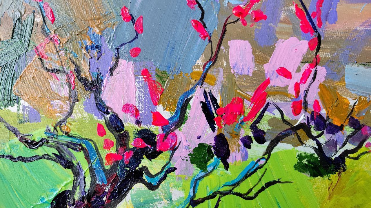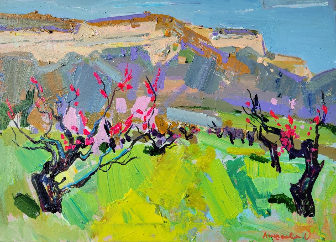 Работа написана с натуры на пленэре. Цветущие персиковые деревья на фоне крымских гор.