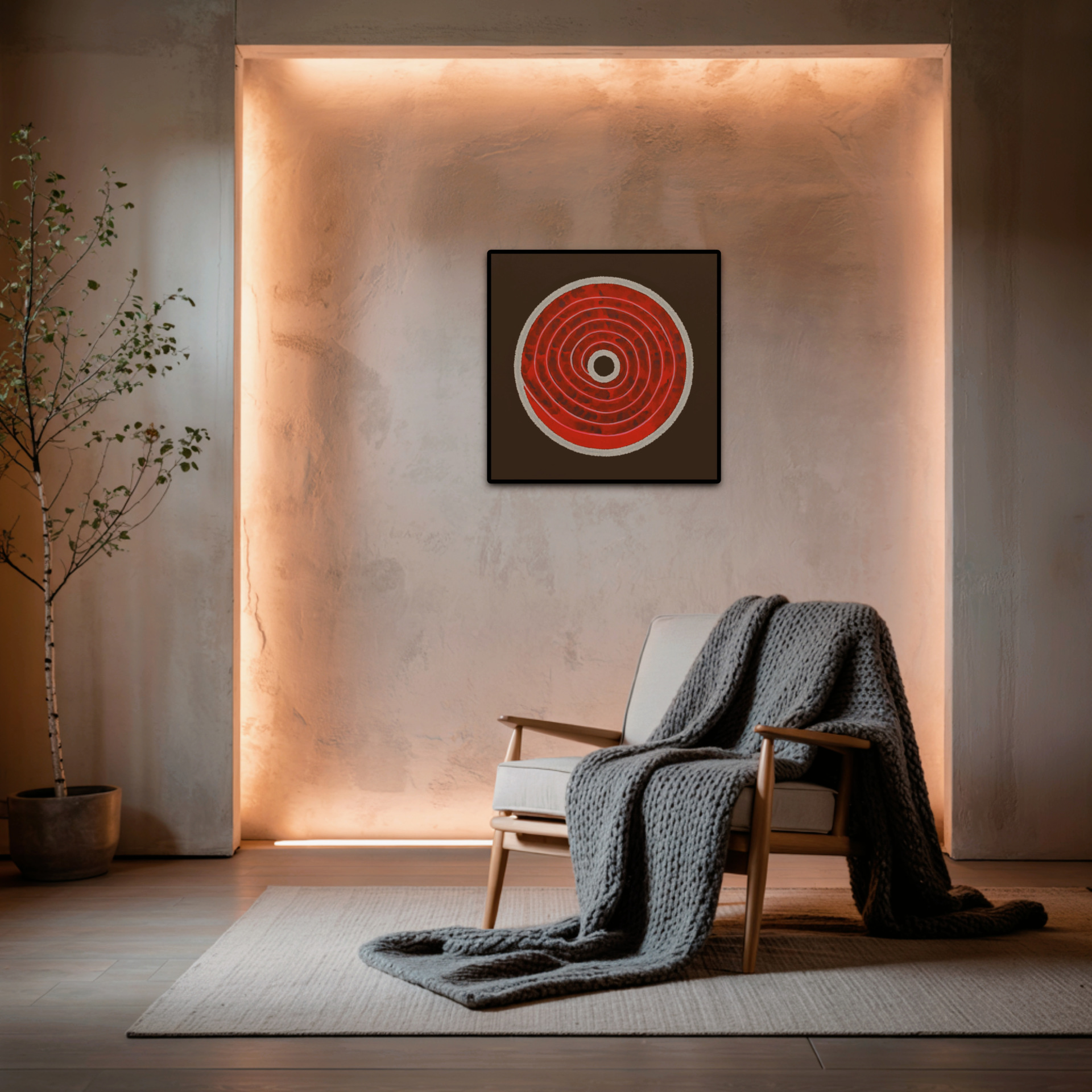 ”Infusion” - три динамичных красно-белых паттерна на черном фоне. Техника легкой, слегка небрежной заливки создает гипнотический визуальный эффект и передает пульсирующую энергию даб-техно. К каким интерьерам подойдут: · Лофт или авангардная гостиная: Картины станут ярким акцентом на кирпичной стене или бетоне, усиливая индустриальный и современный характер пространства. · Домашняя студия звукозаписи или кабинет меломана: Они не просто впишутся в атмосферу, а станут её источником вдохновения, визуализируя ритм и глубину музыки. · Современный минимализм: Лаконичная палитра (черный, белый, красный) и смелый графичный паттерн идеально дополнят интерьер в стиле минимализм, добавив ему необходимую динамику.